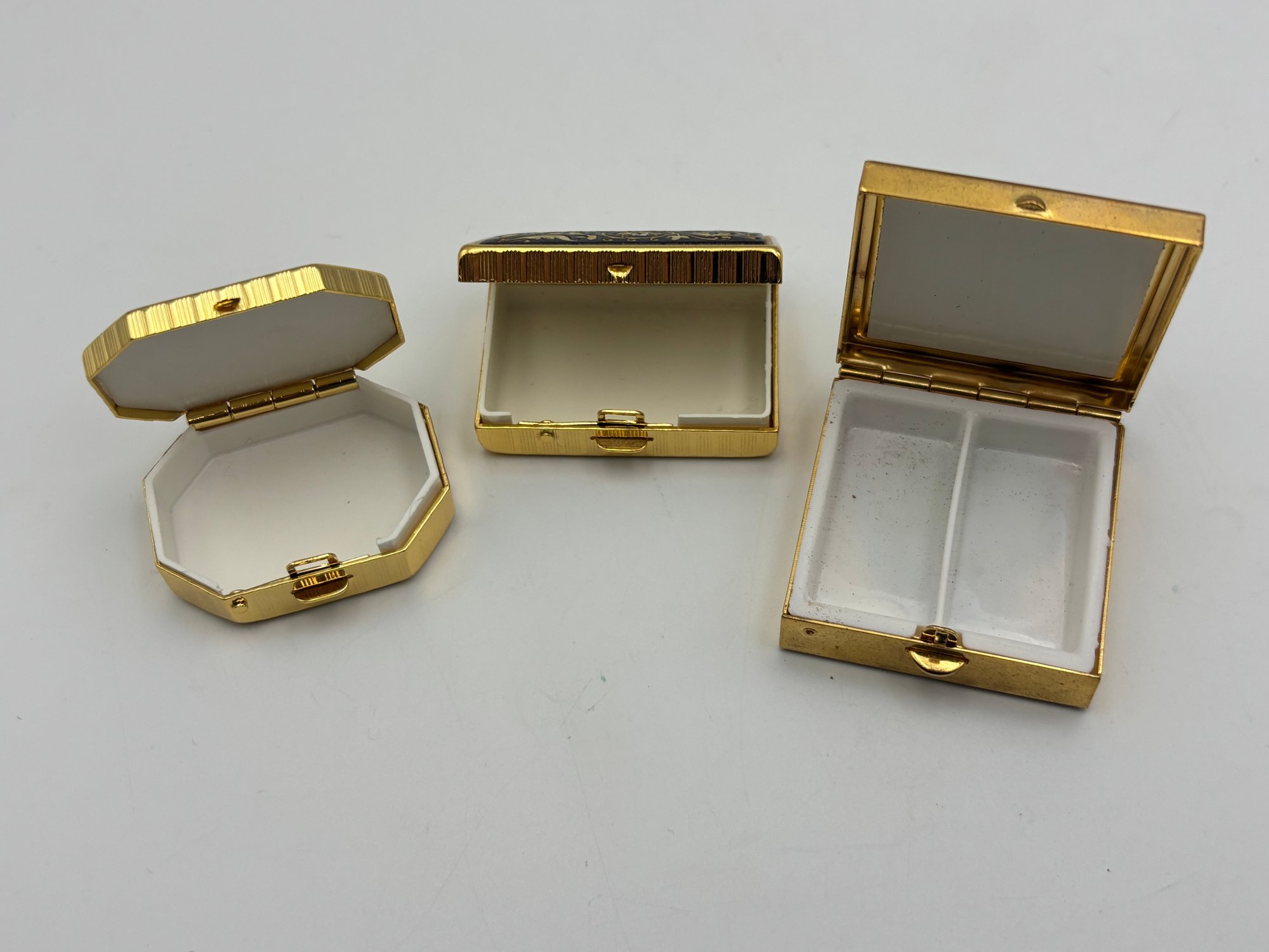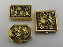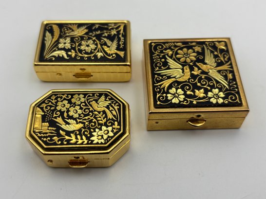 Vintage Damascene Spanish Birds & Flowers Black & Gold Metal Mini Pill Box Lot Of 3