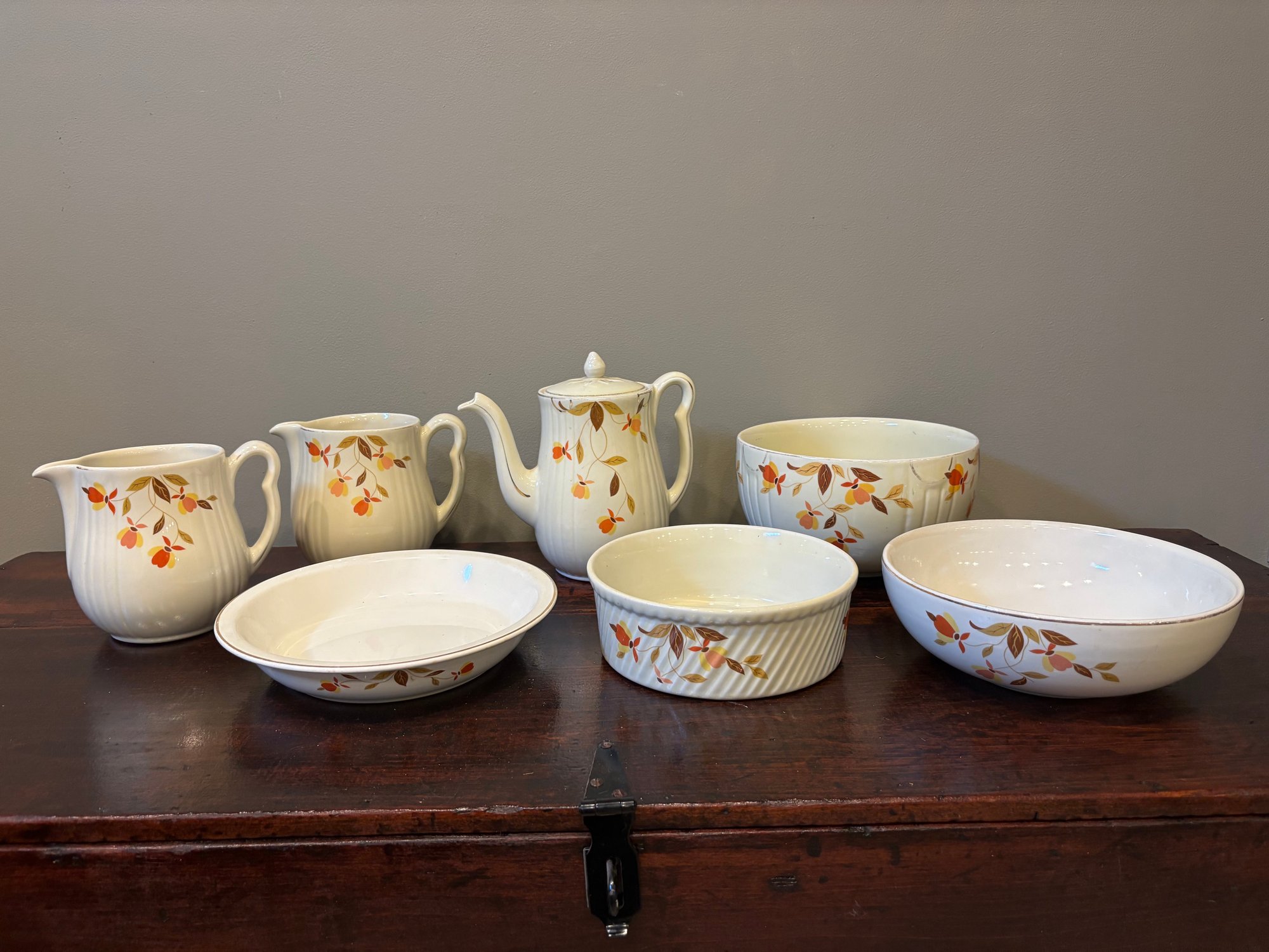 Vintage Halls Superior Jewel Quality Kitchenware Autumn Leaf Lot - Bowls, Teapot, Creamer