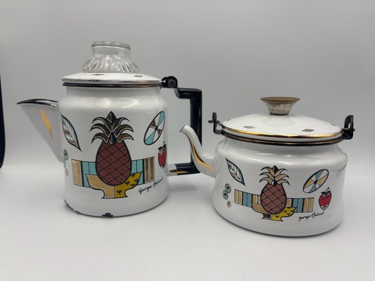 Vintage MCM Mid Century Georges Briard Metal Enamelware Tea Pot & Percolator 7" & 4.75"