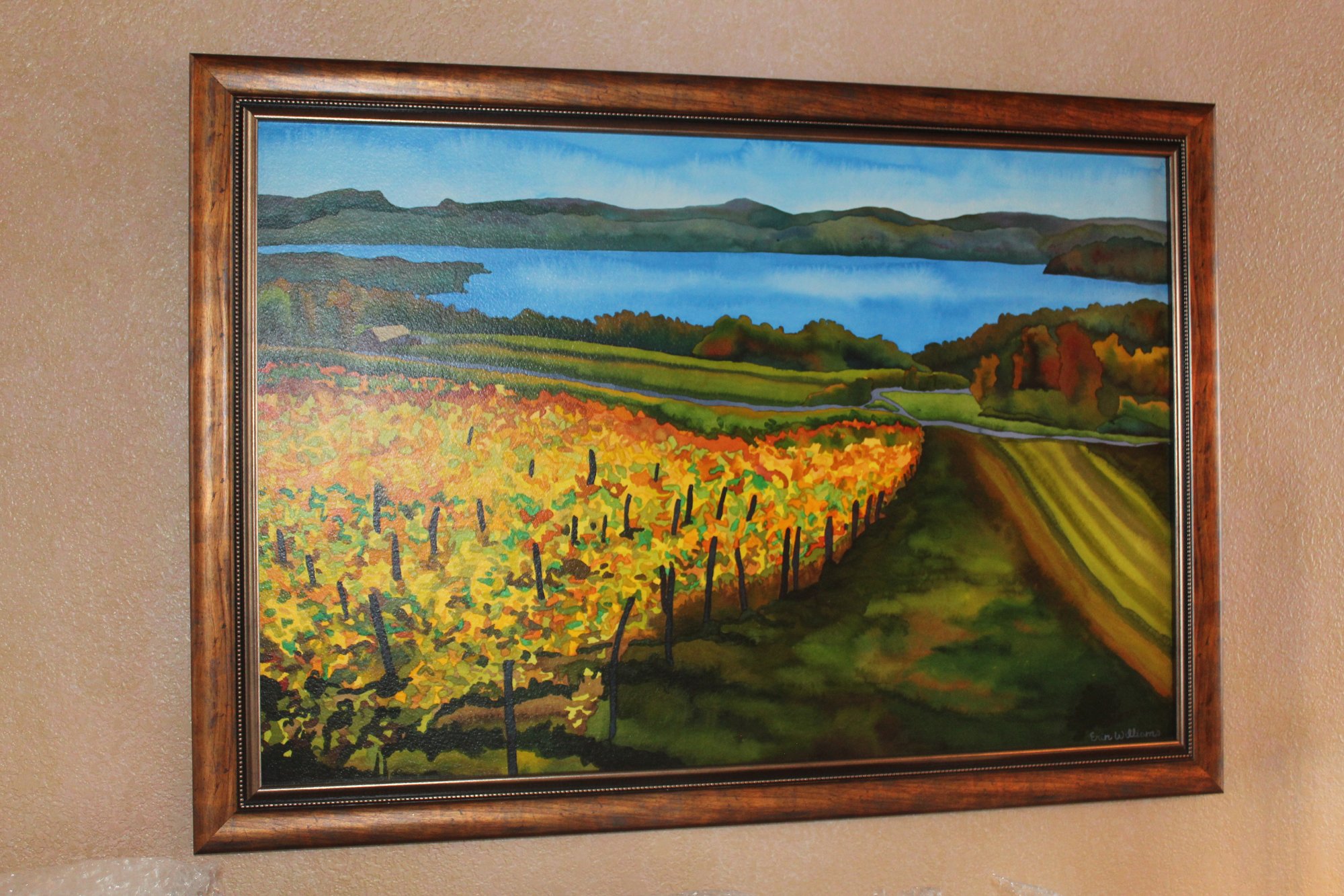 Beautiful hand painted piece in a high-quality wooden frame. Colors really pop in the light -- see photos