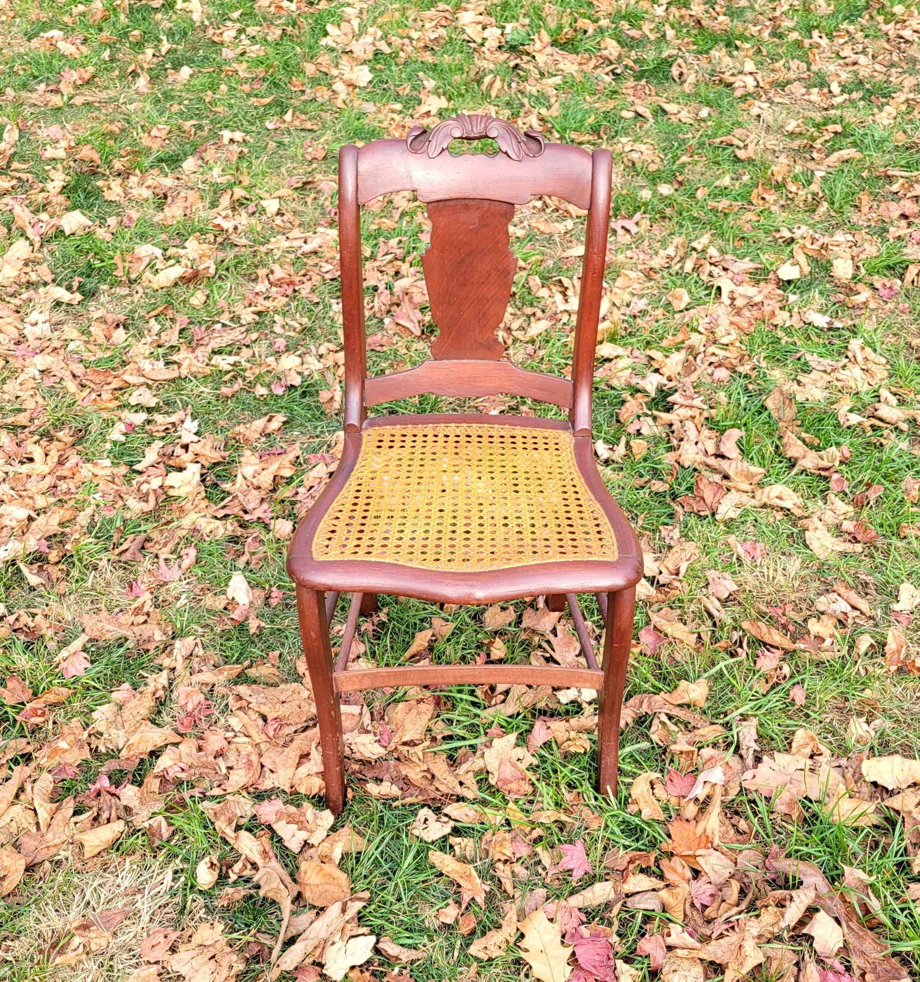 It has floral carving and a woven seat. Good condition.