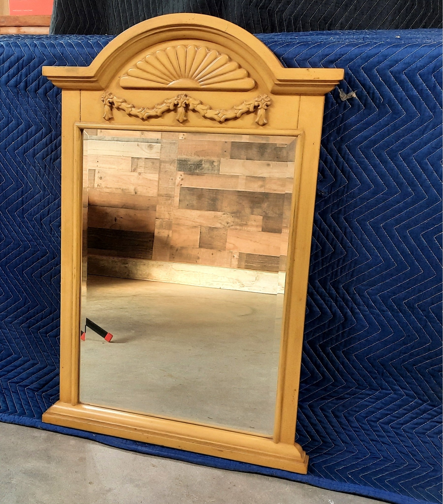 A pretty wood framed mirror painted mustard yellow.