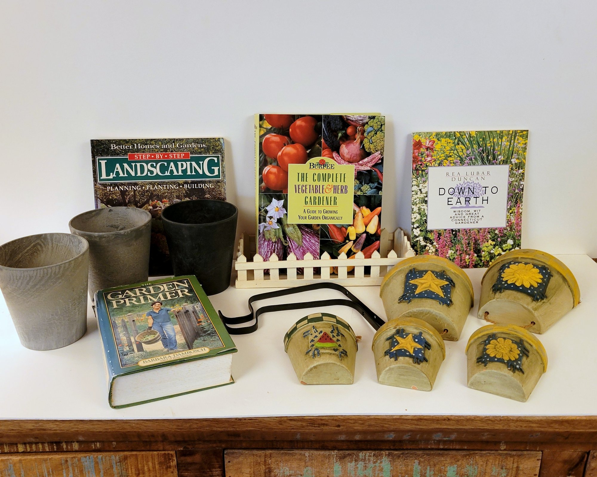 Books, concrete-look plastic flower pots, plant hangers, double hanging terra-cotta flat back flowers pots, wood picket fence basket.