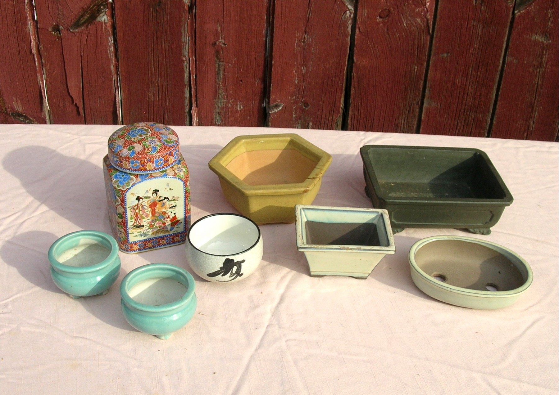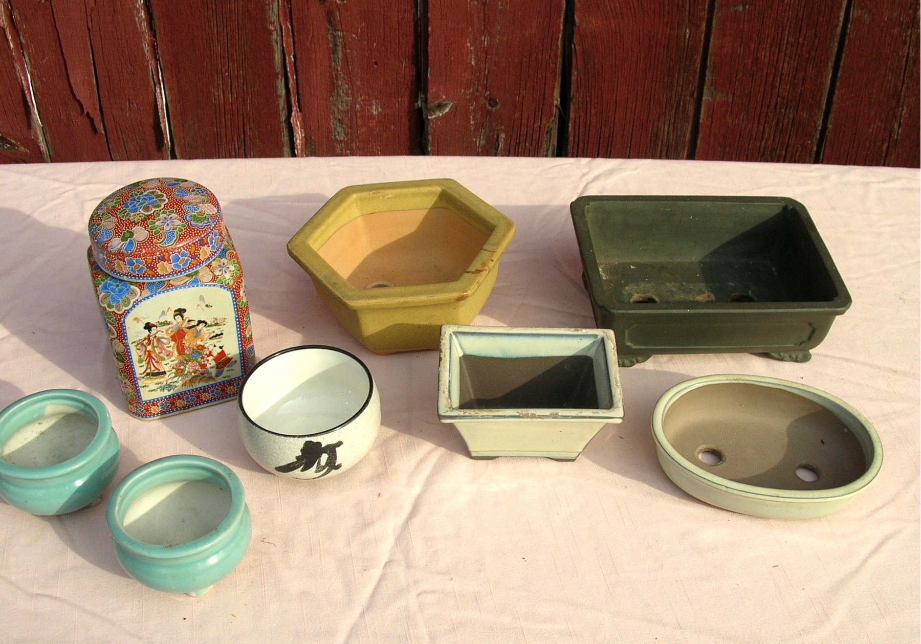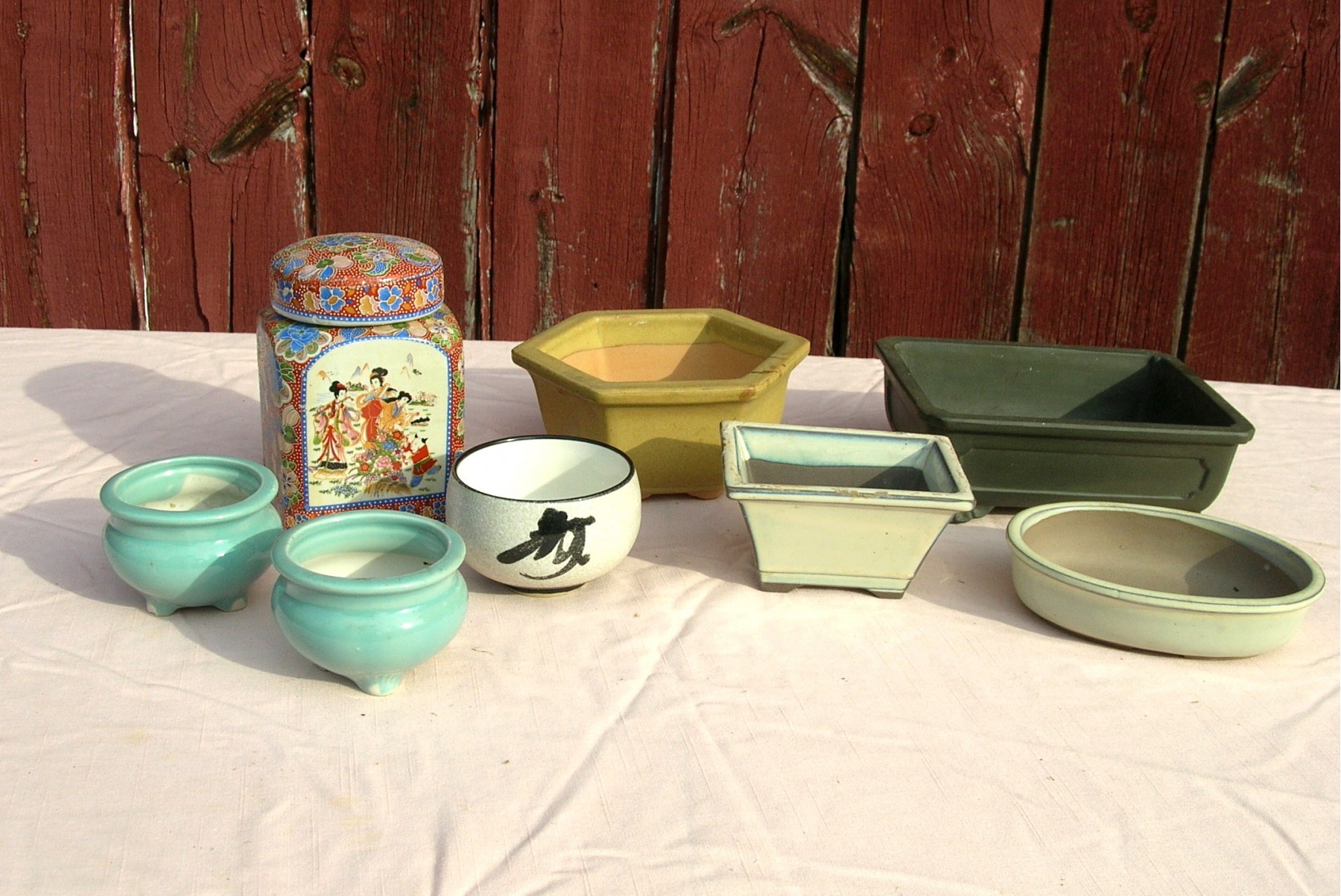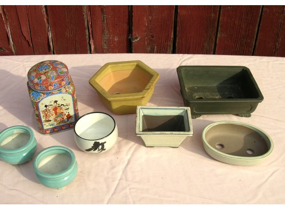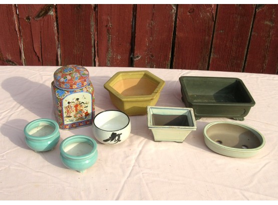 Seven are little planters and one is a covered storage jar.