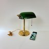Green glass shade desk lamp, 14" high. Tiny chip on shade (barely noticible in person) and tarnish on base.