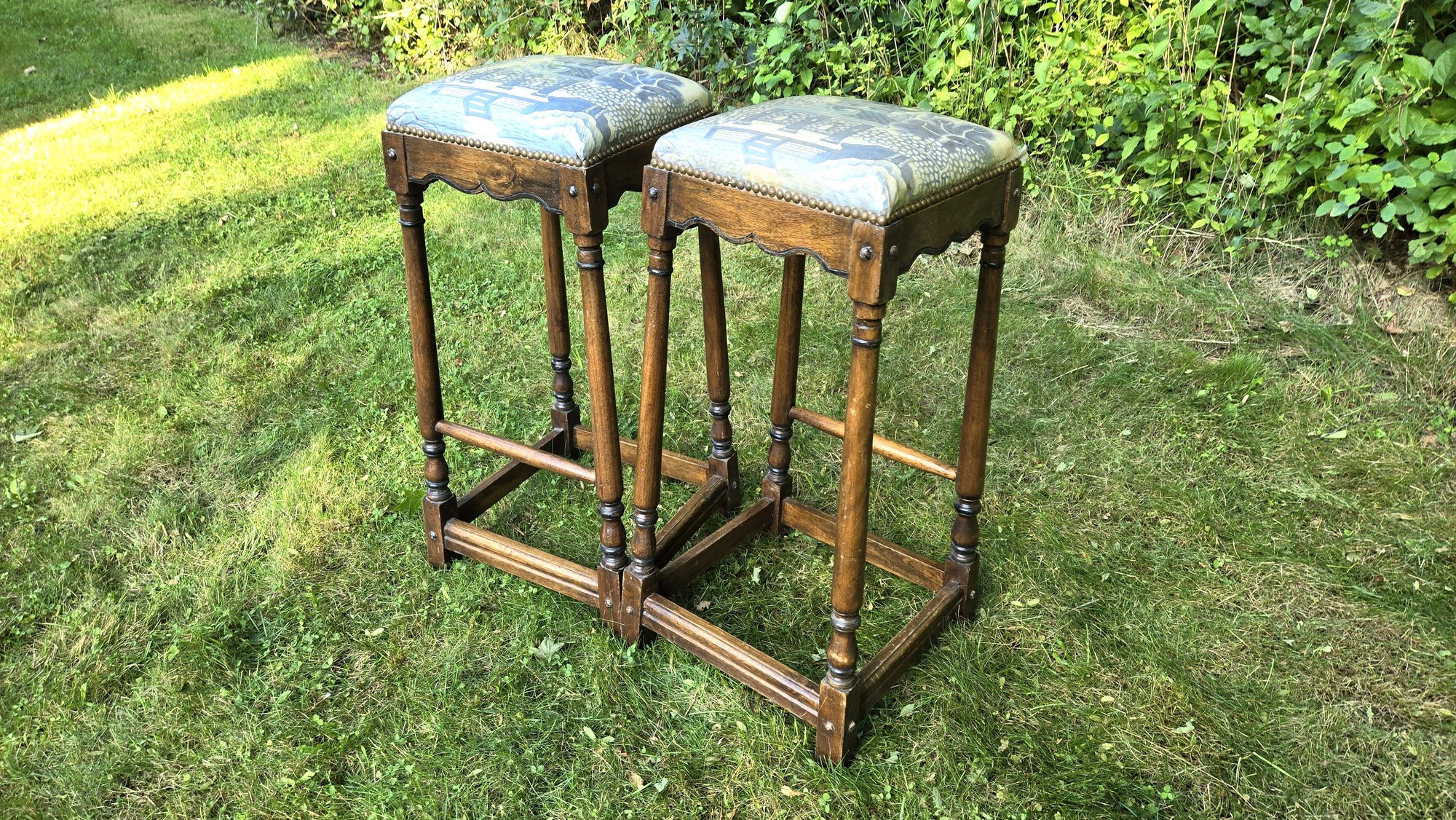 Bar Stools Pair Blue and White Upholstery
