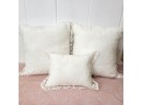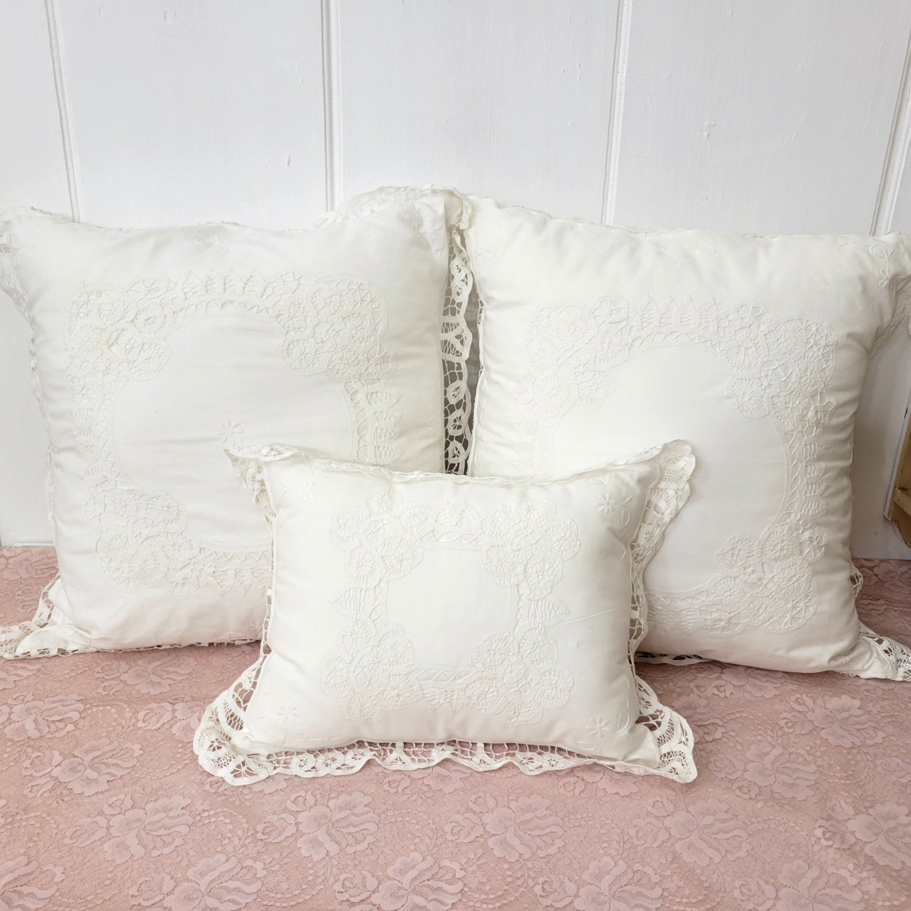 Three beautiful white cotton lace pillow covers including stuffers. Two pillows measure 20" x 20" and one is 12" x 16".
