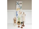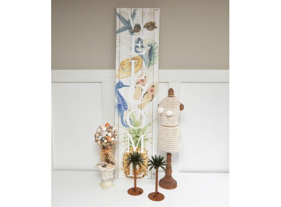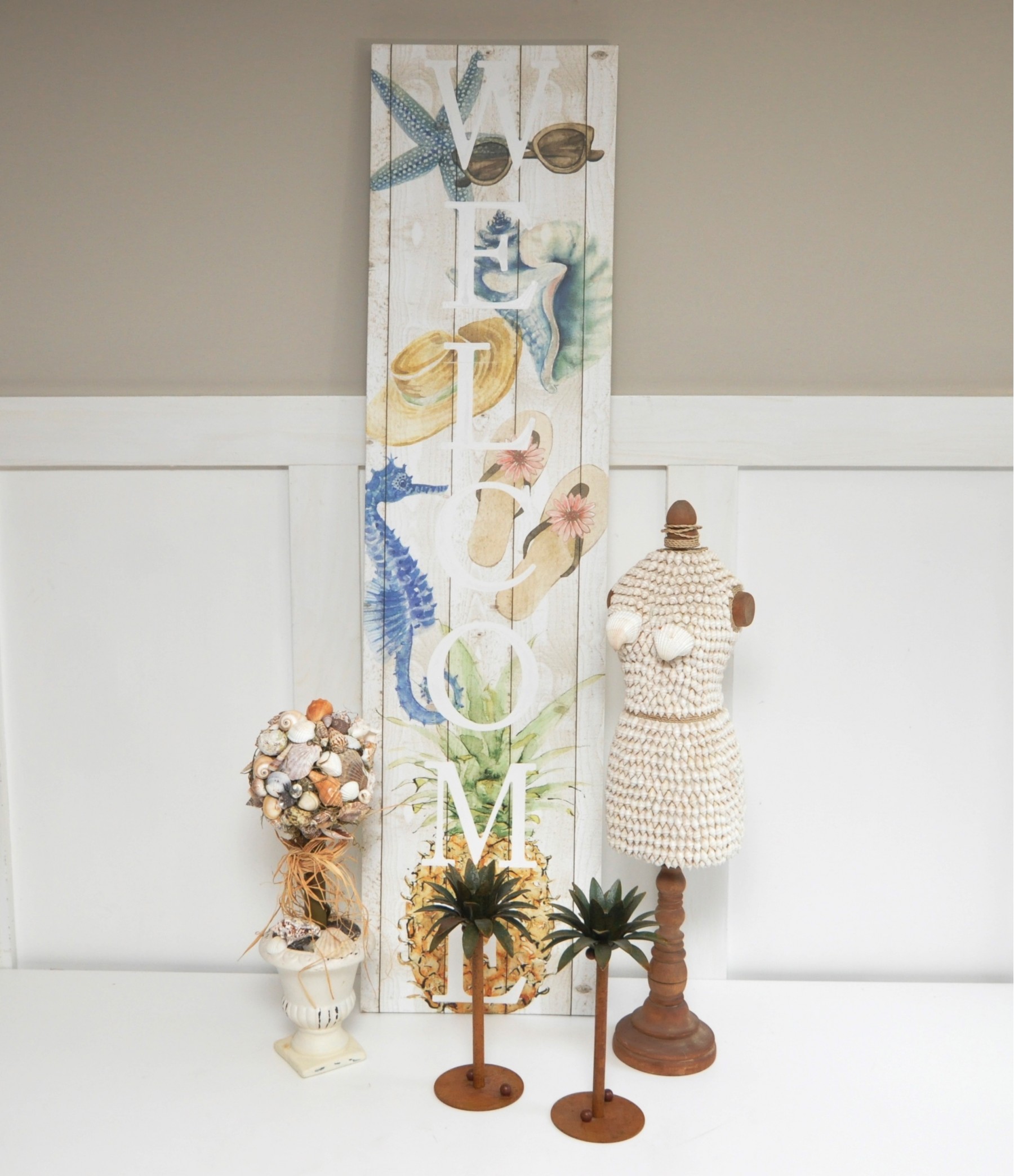 Canvas welcome print (12" x 48"), seashell topiary, seashell dress form, palm tree candleholders.