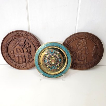 Brass Aztec Calendar and Carved Wood Plaques Wall Decor
