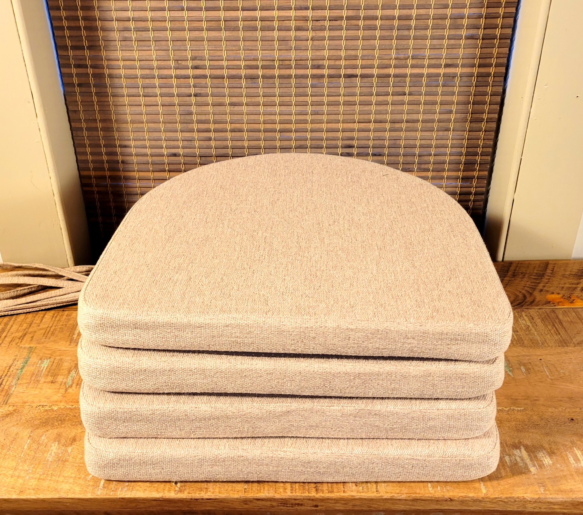 A set of four tan fabric chair pads with ties and non-slip backing.