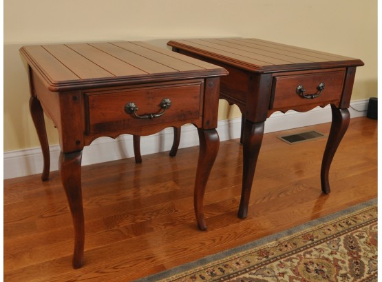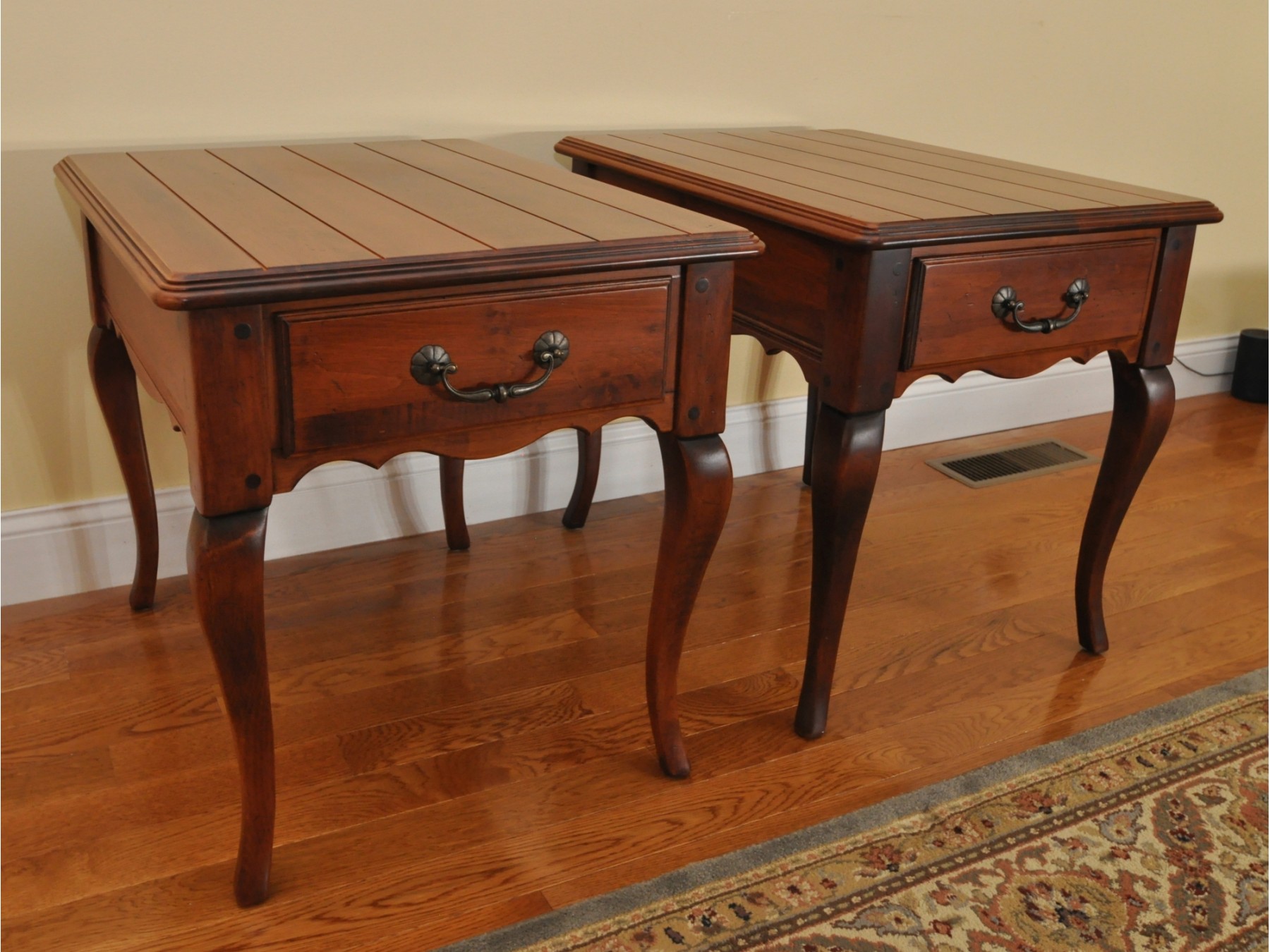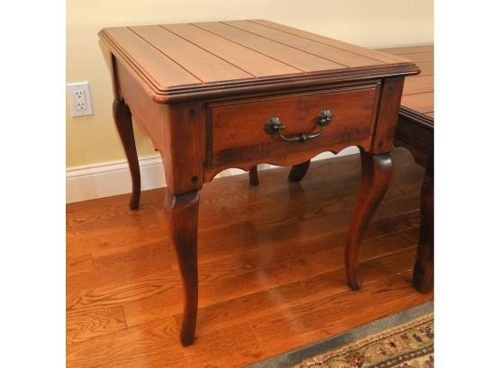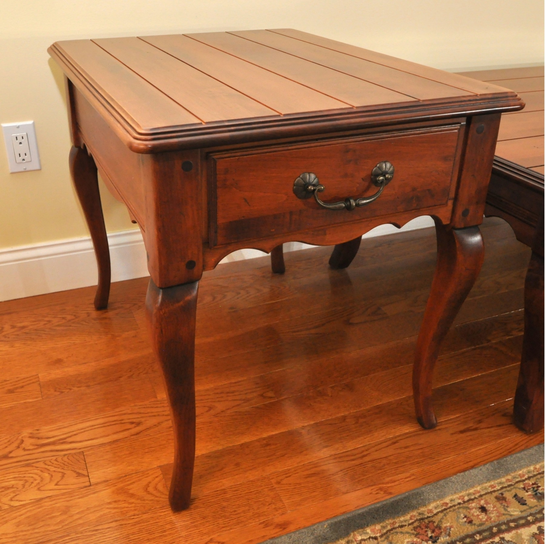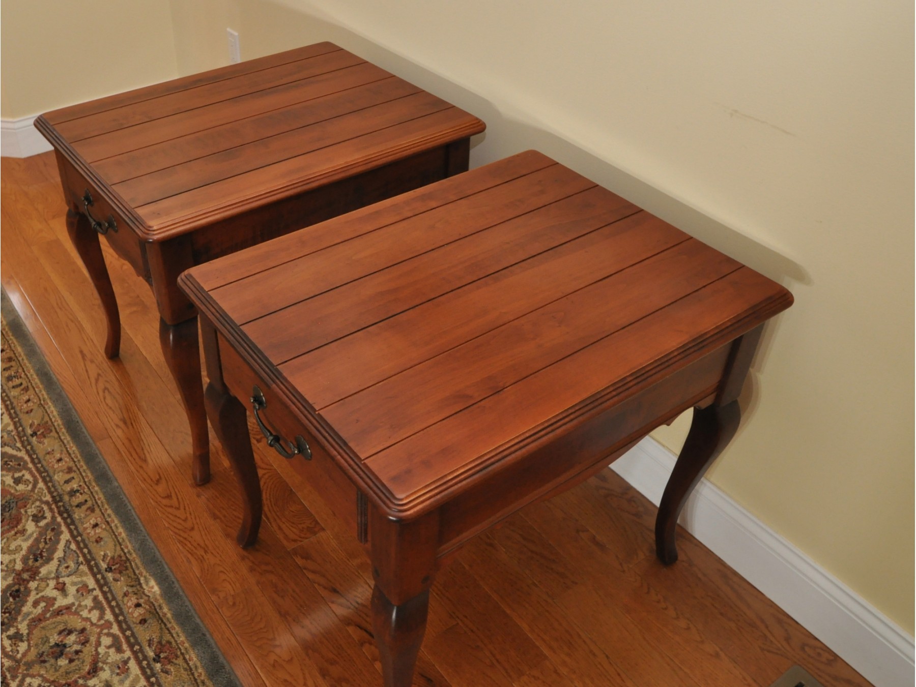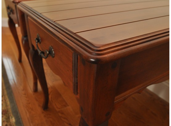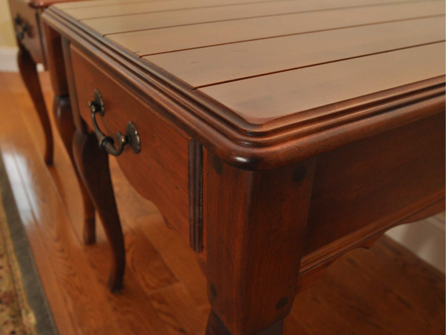 American made, hardwood, one drawer end tables. They measure 22" x 28" x 24" high. Excellent condition. They match the coffee table listed separately.