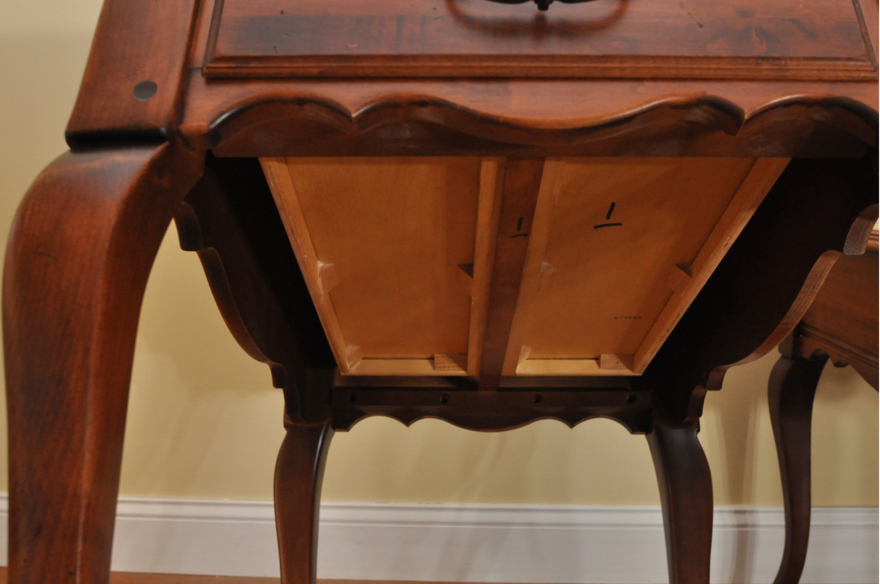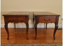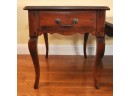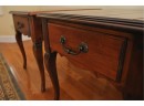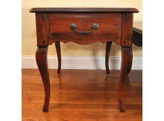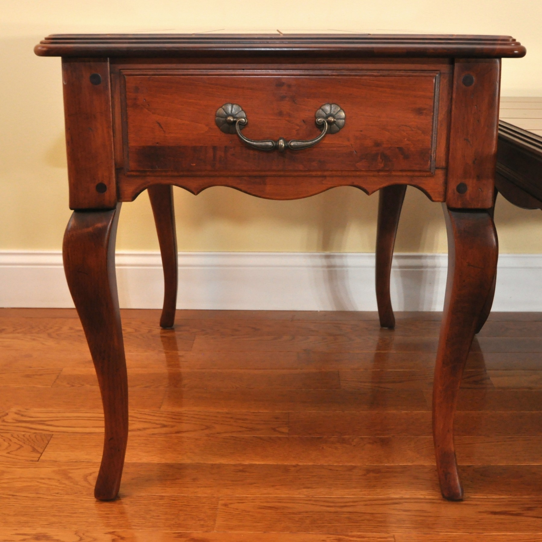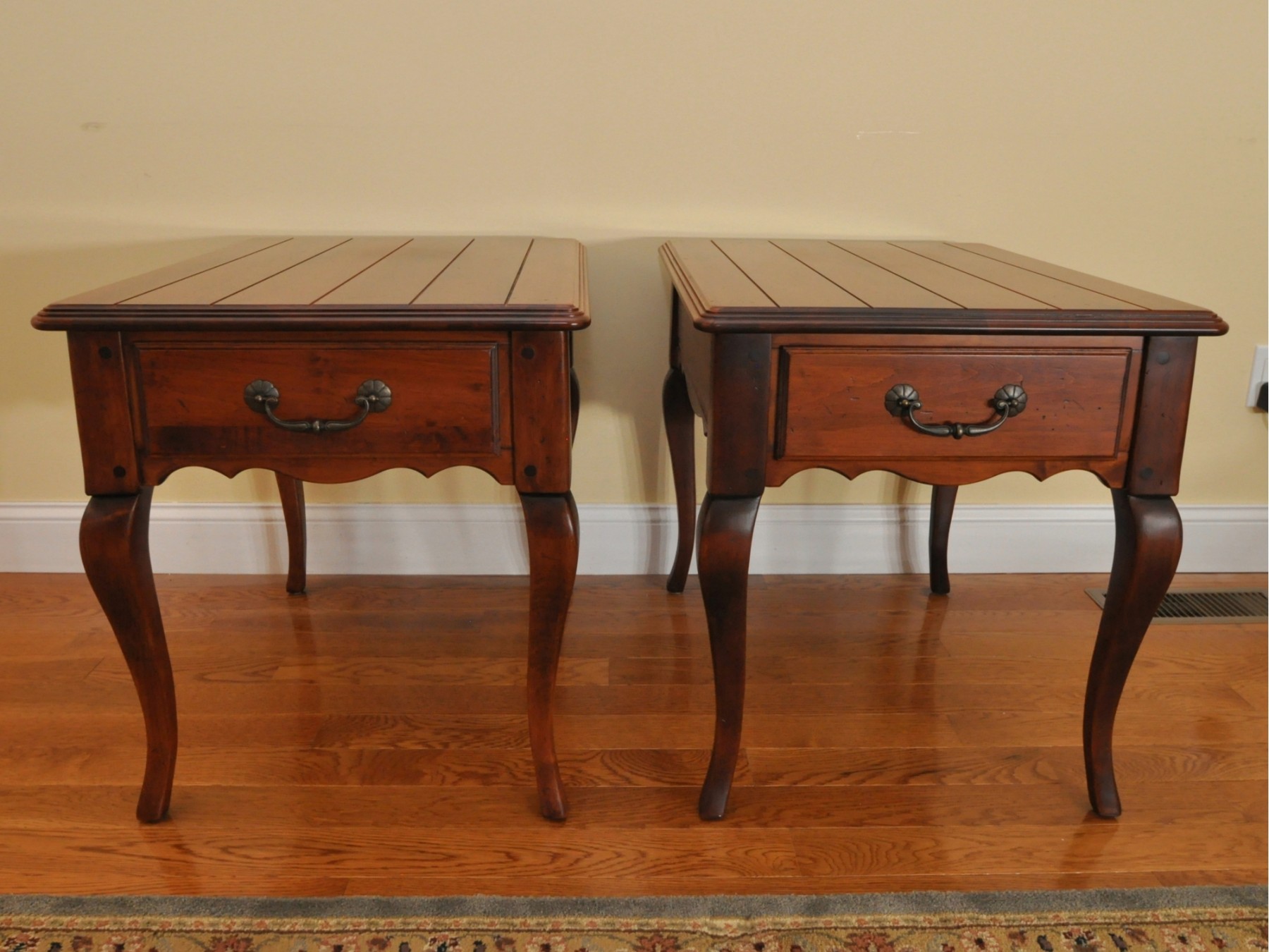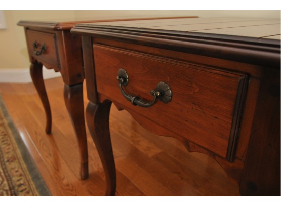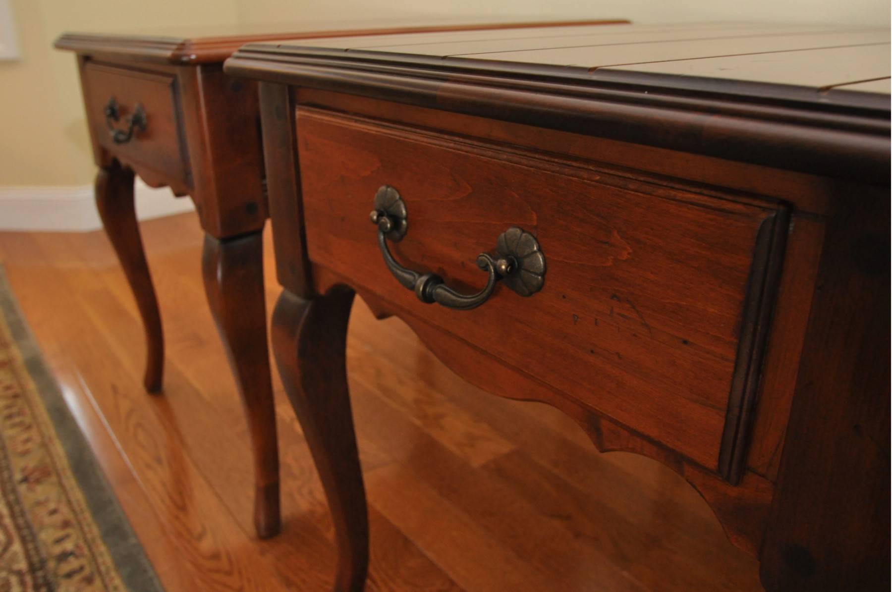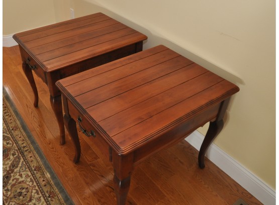 American made, hardwood, one drawer end tables. They measure 22" x 28" x 24" high. Excellent condition. They match the coffee table listed separately.
