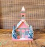 Decorated Paper Mache church, 6" x 6" x 9 1/2" high.