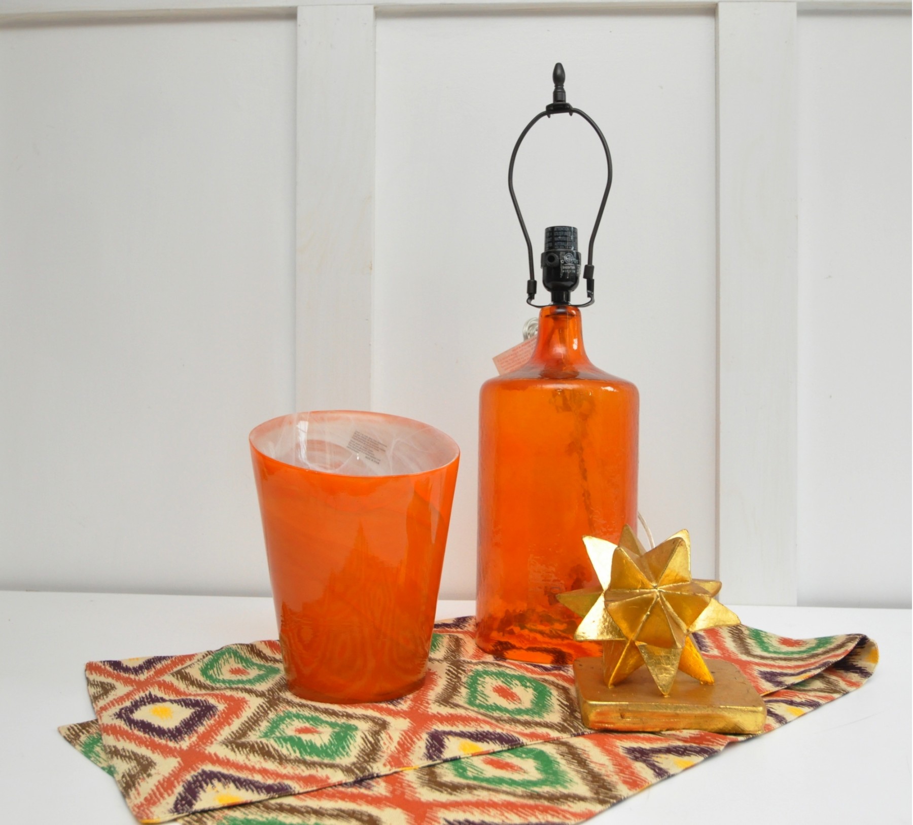 Glass lamp base, vase, table runner, gold star.