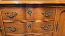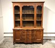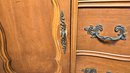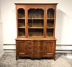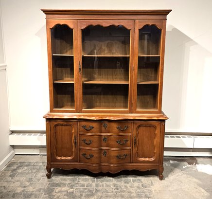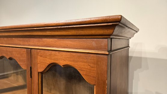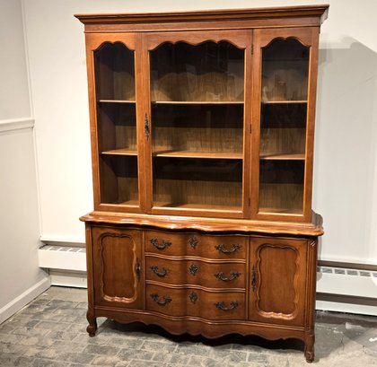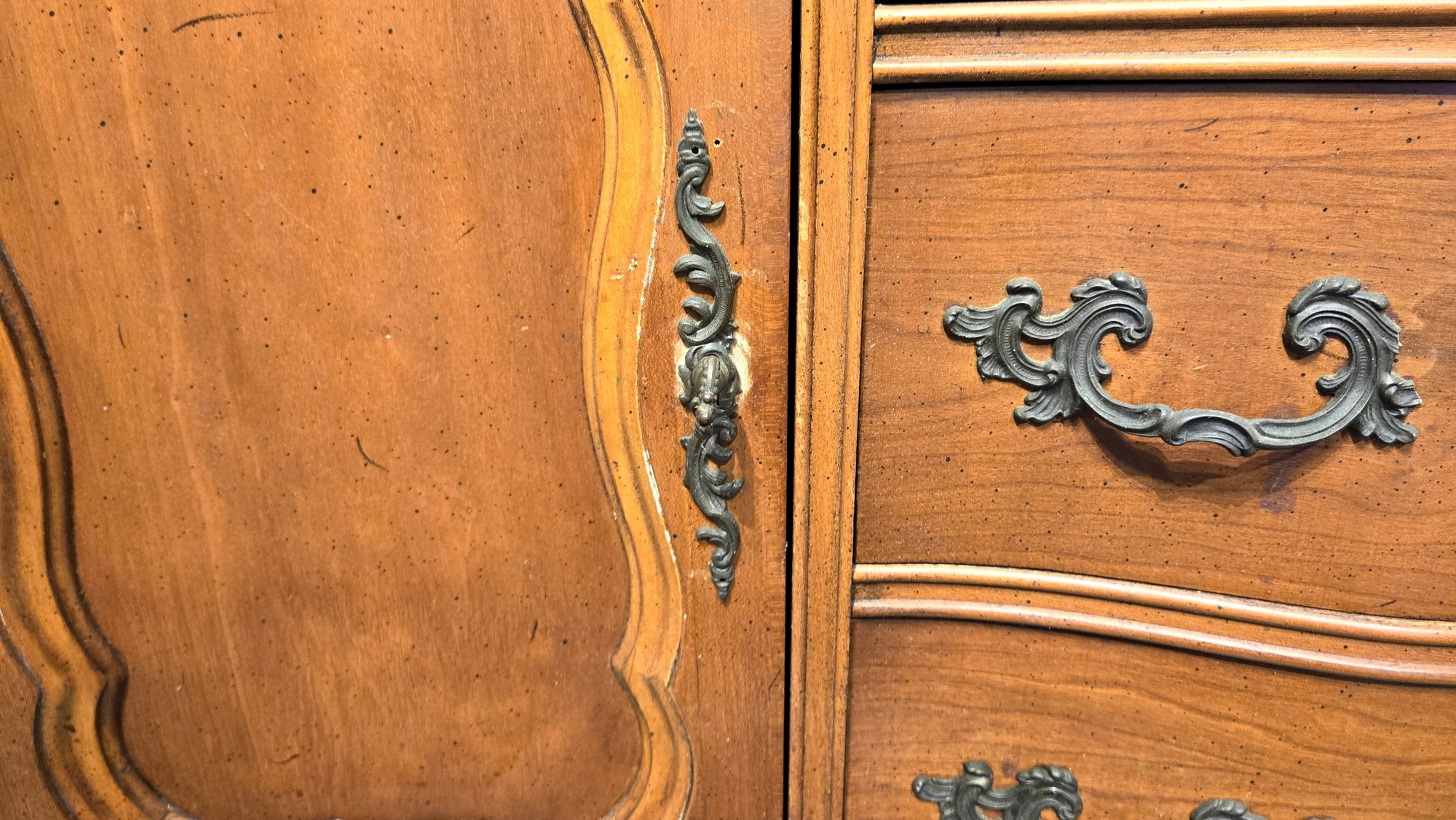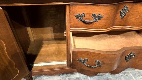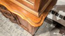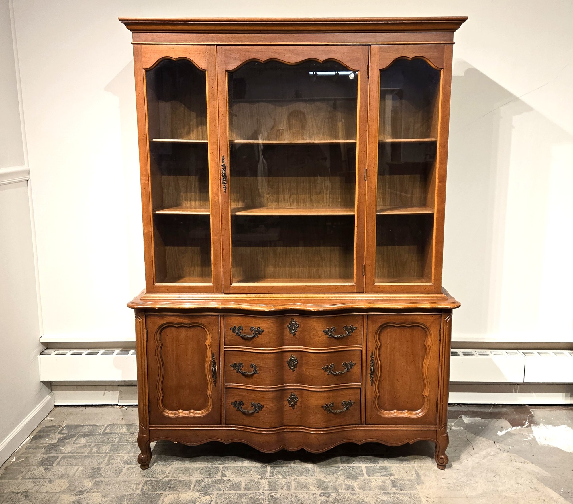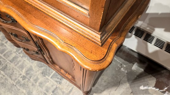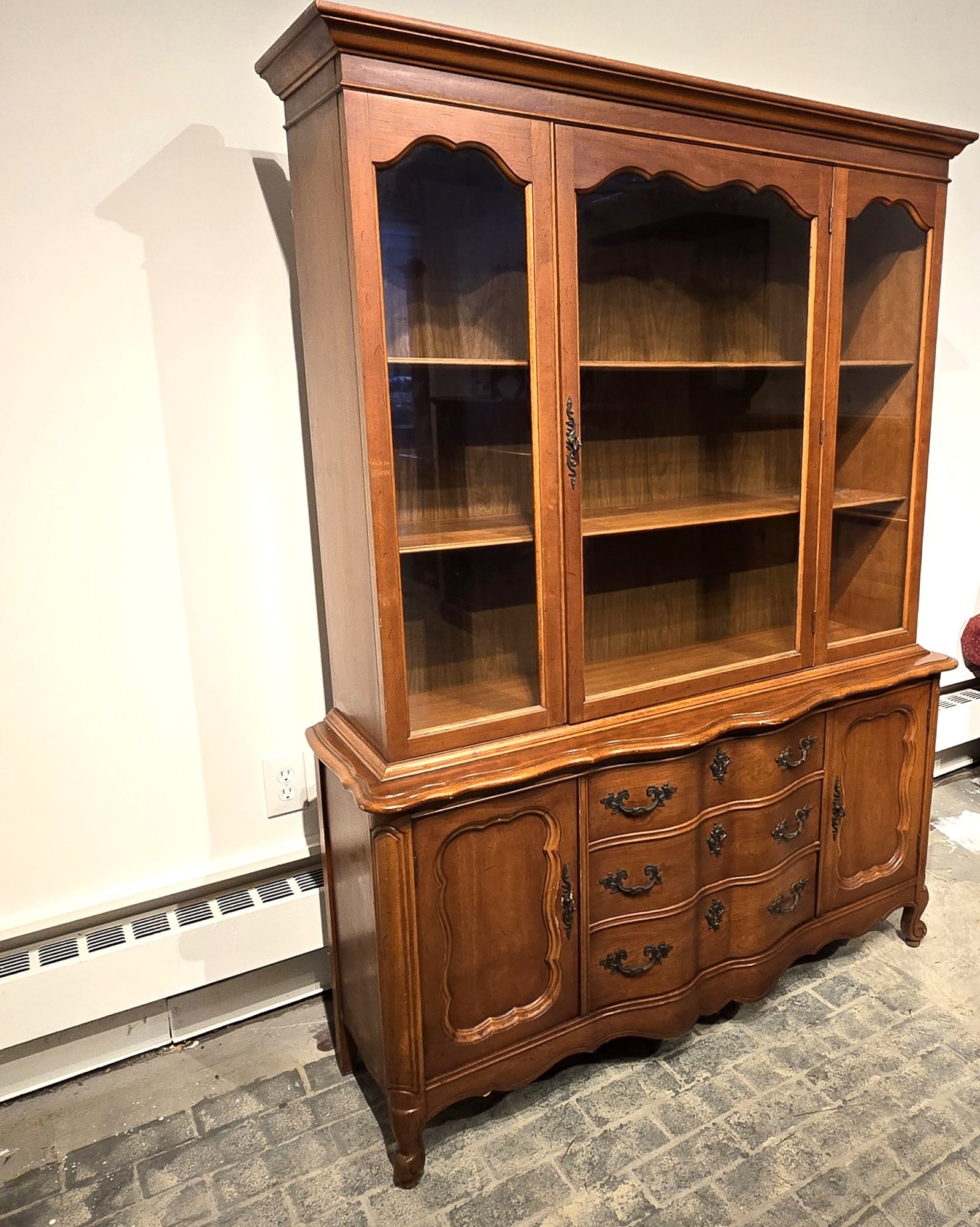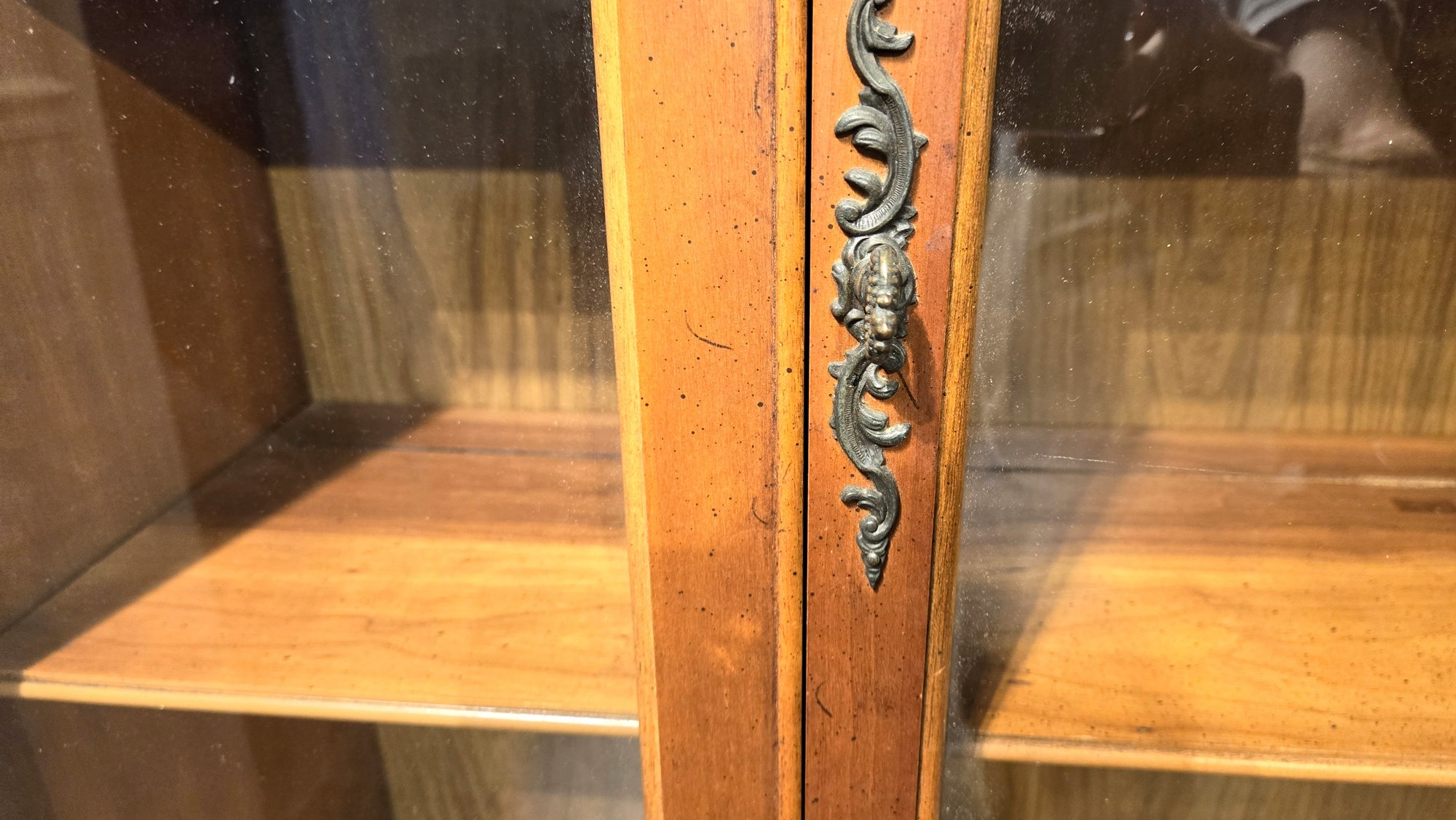 Cherry veneer, glass doors, ornate hardware. It has a bit of wear and tear but overall it is in nice condition.