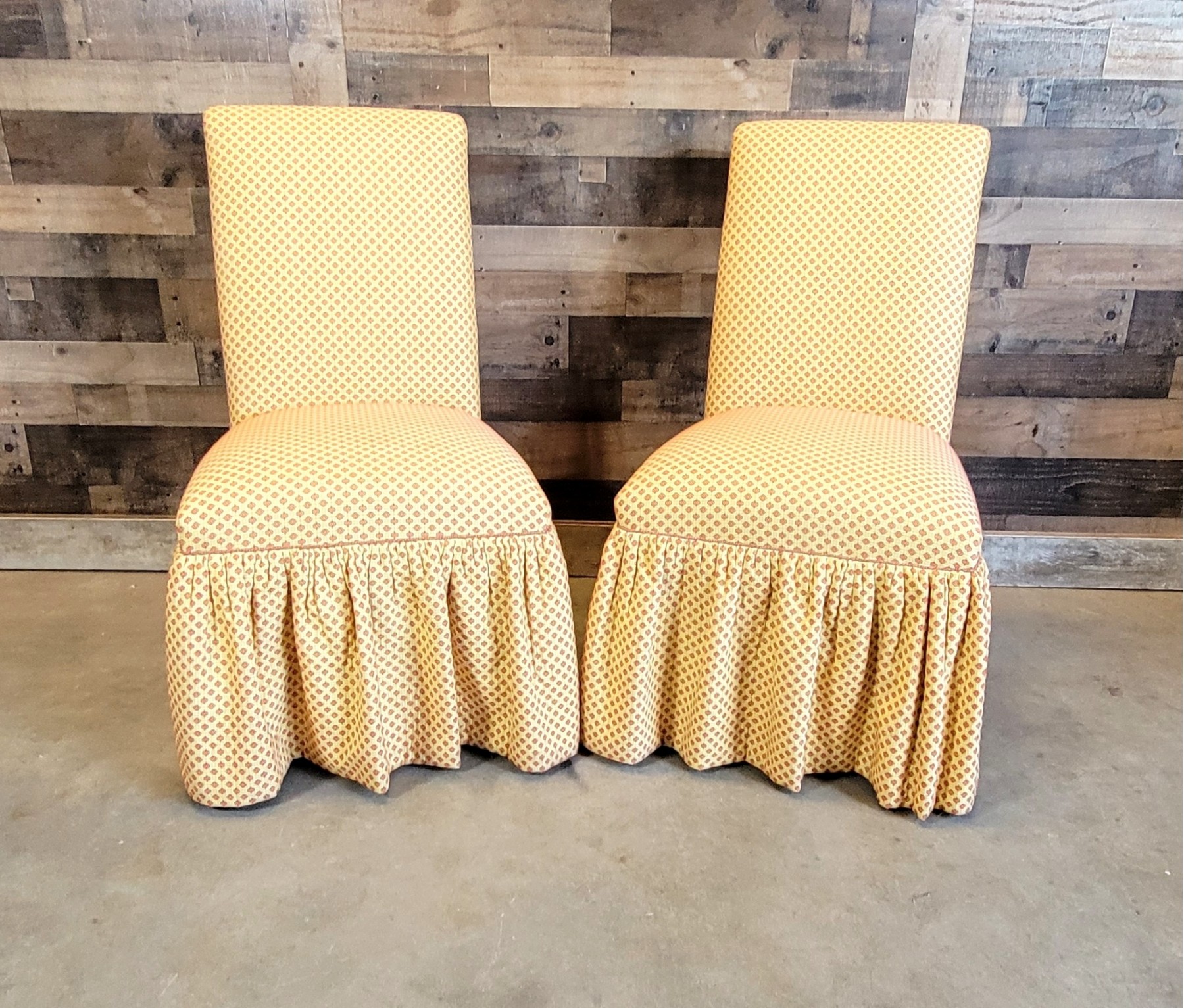 Yellow and orange-red fabric with ruffled skirts and back detailing. Good condition.