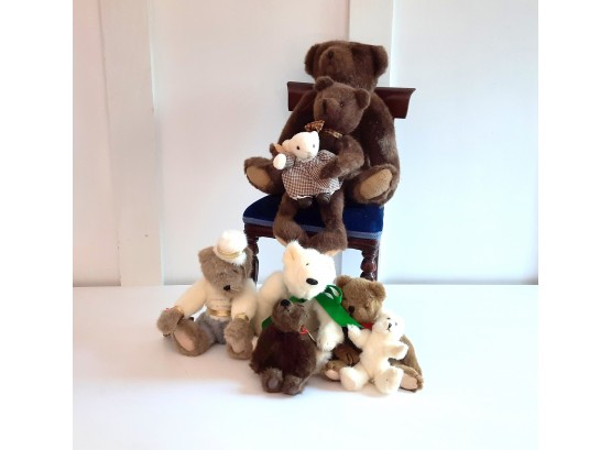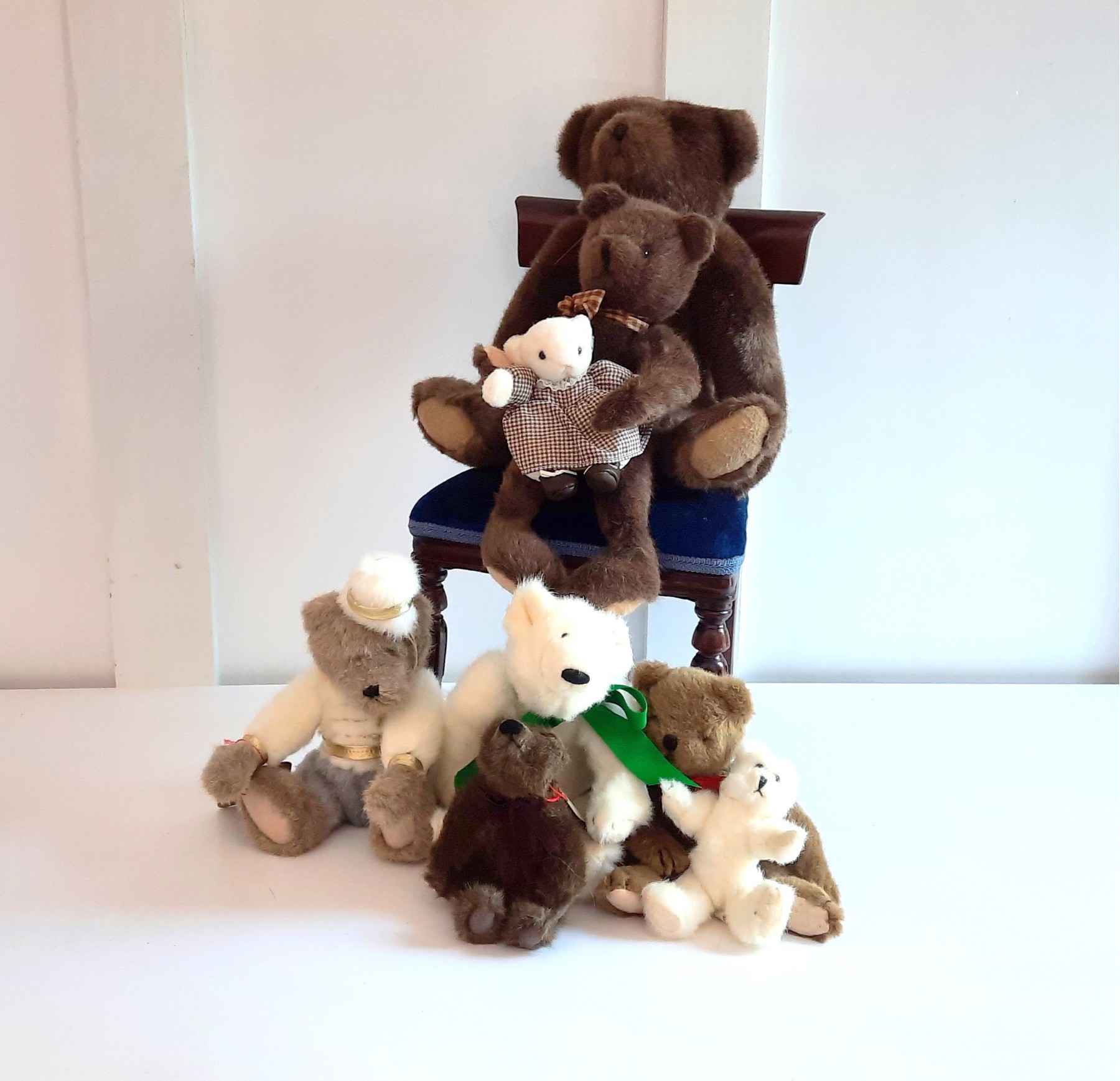 The chair has a broken leg that was repaired (see photos). Bears include many Boyd's Bears with tags.