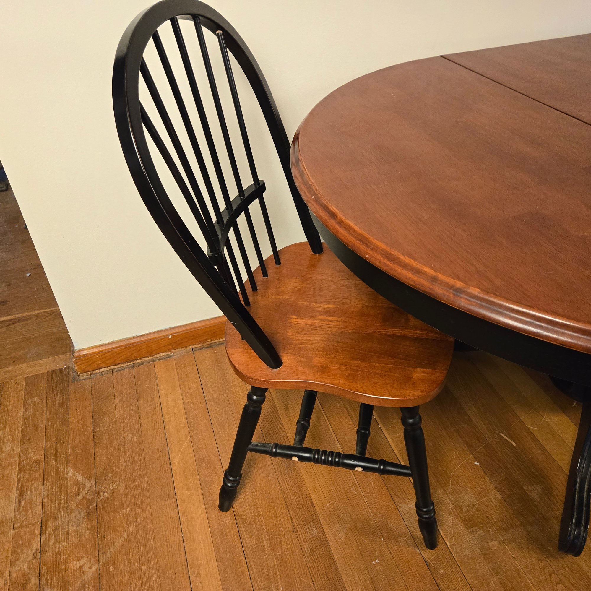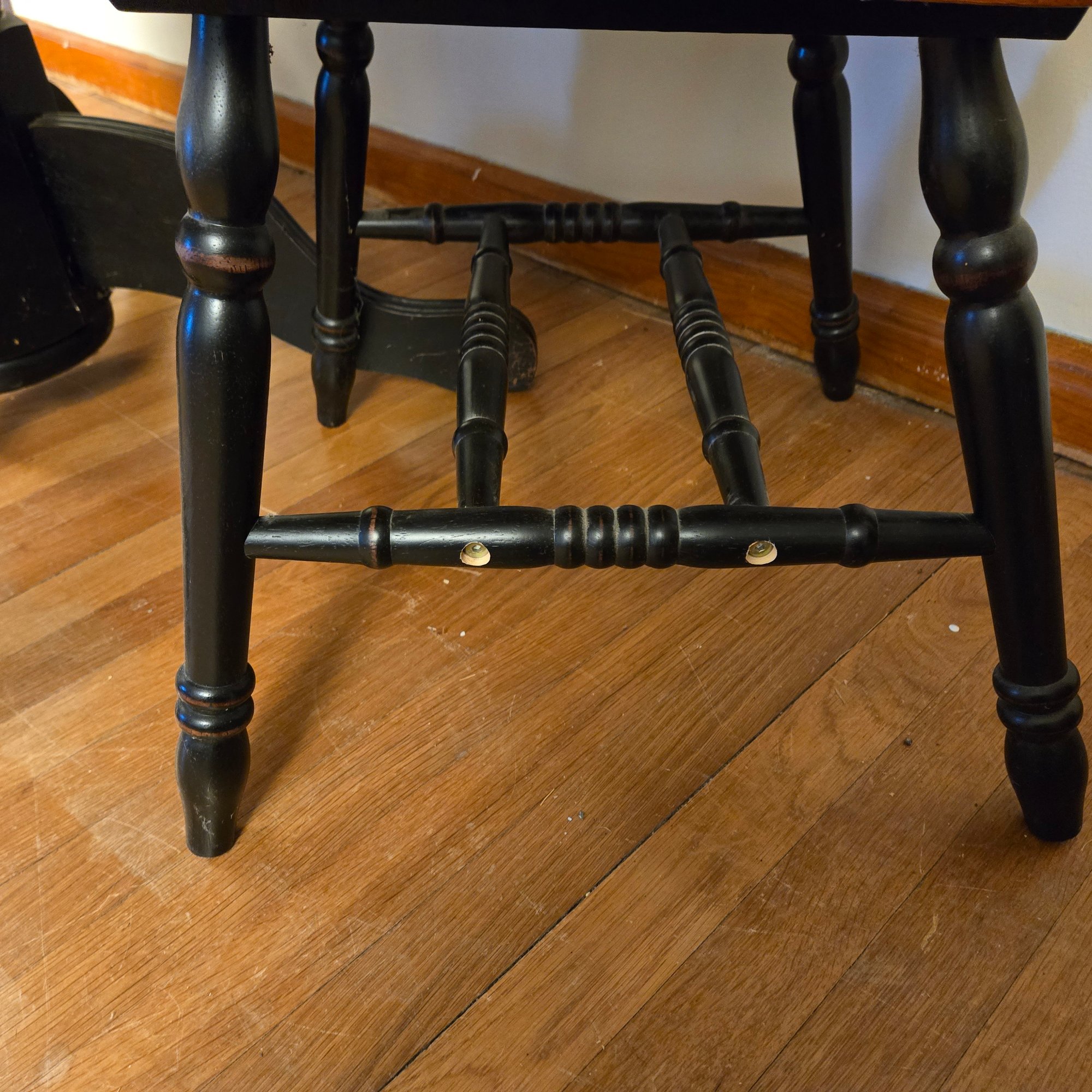 Chairs have missing wood plugs at the stretchers, and need tightening.