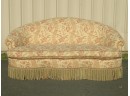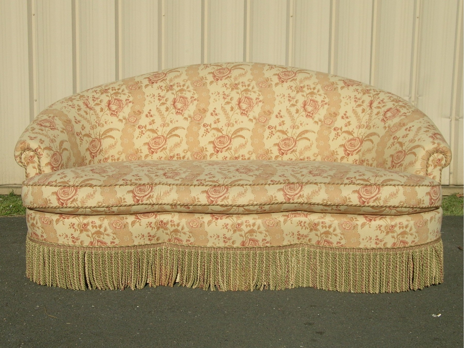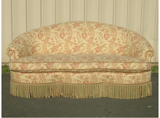 A fancy sofa with bullion fringe around the entire skirt. It measures 81" wide x 43" deep x 39" high. The seating depth is 28" and seating height is 19". A very pretty, unusual shape.