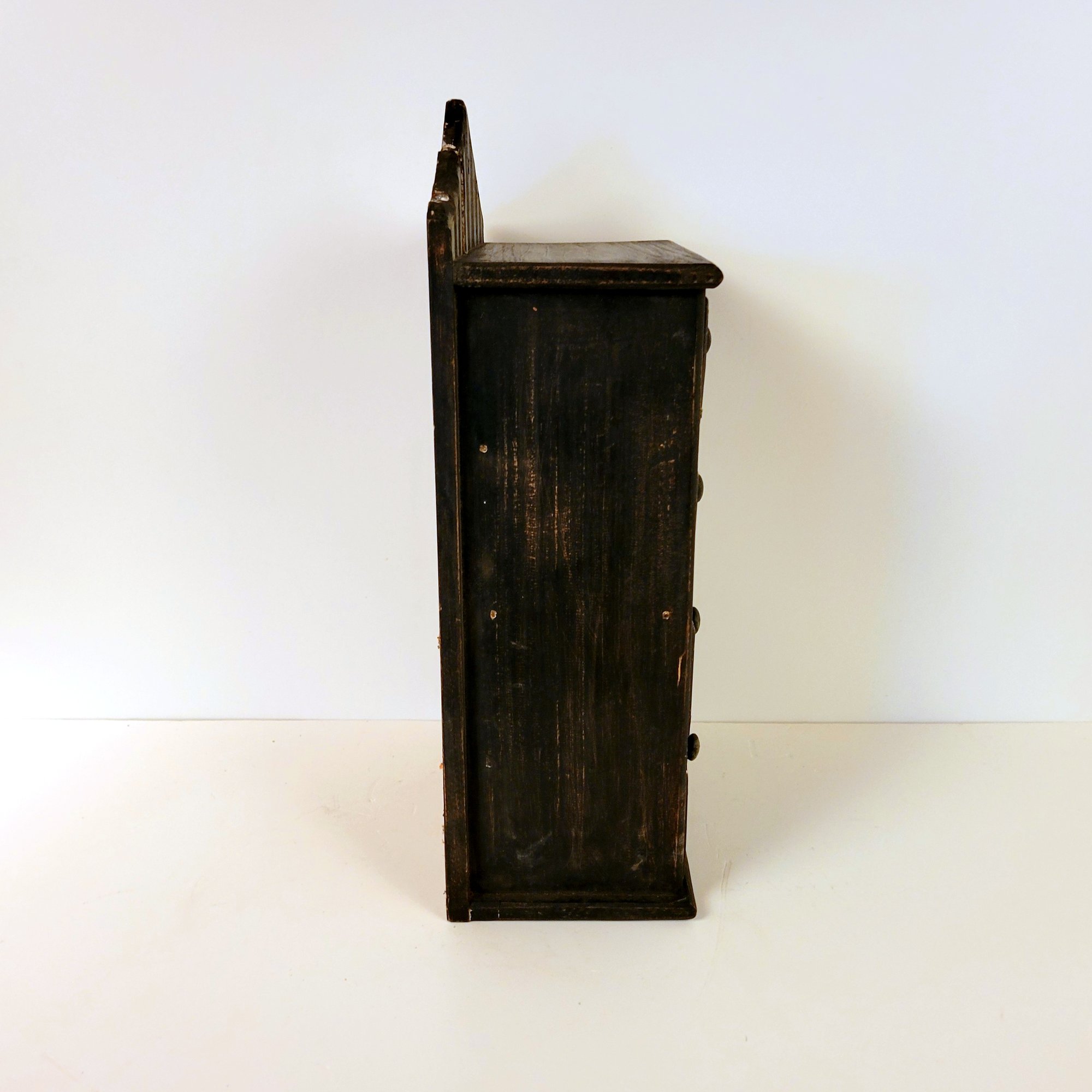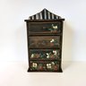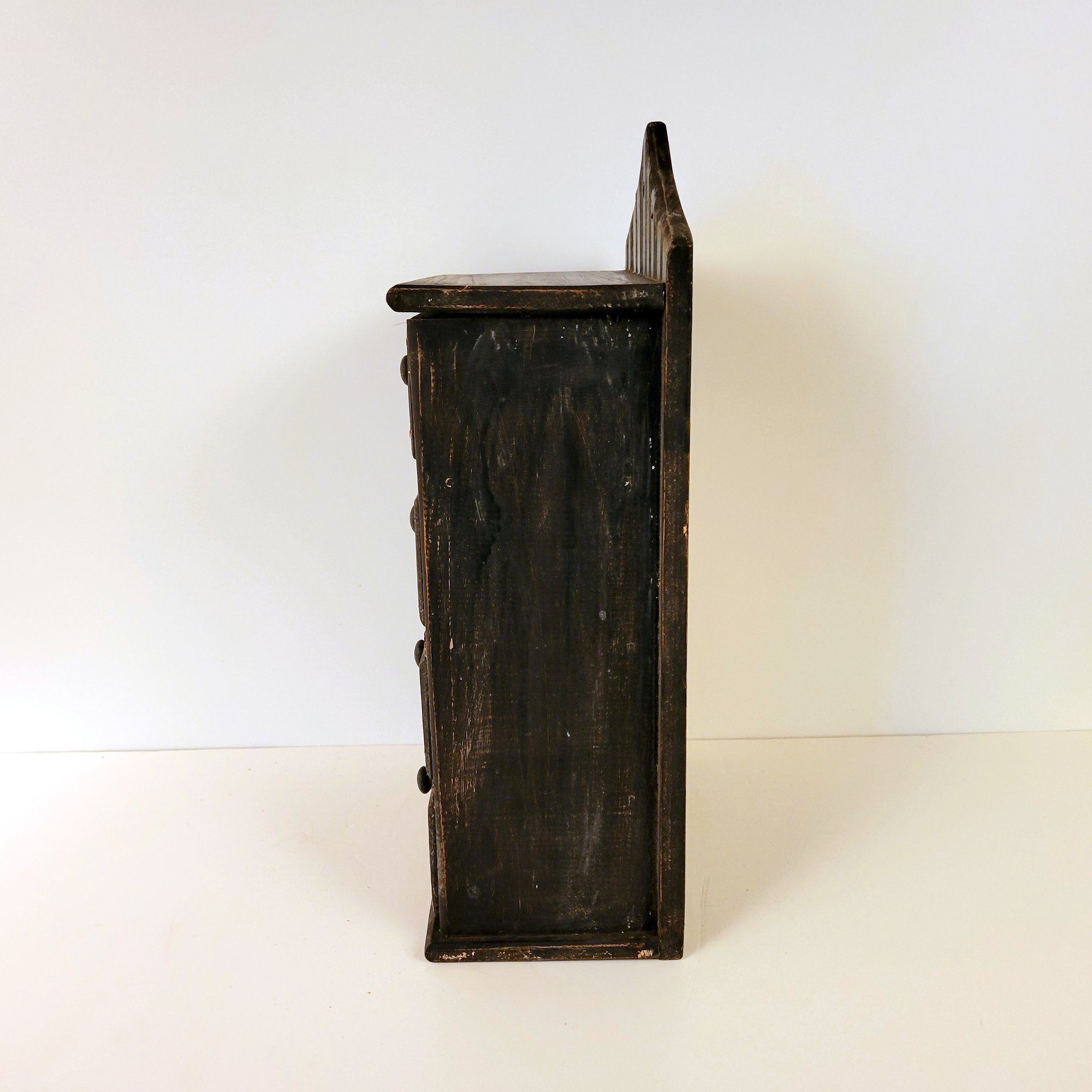A small rustic table top cabinet with drawers. It measures 10" wide x 6" deep x 18" high.