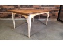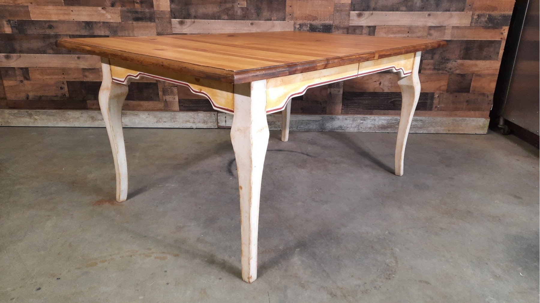 A rustic cabriole leg dining table. It is missing it's leaf. It measures 60" x 40".