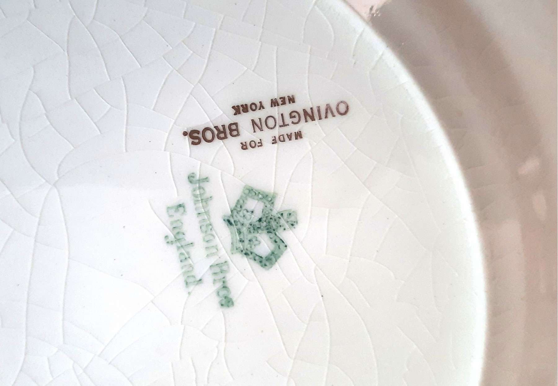 They measure 8" and they are marked Johnson Bros. England, Made for Ovington Bros. New York.