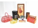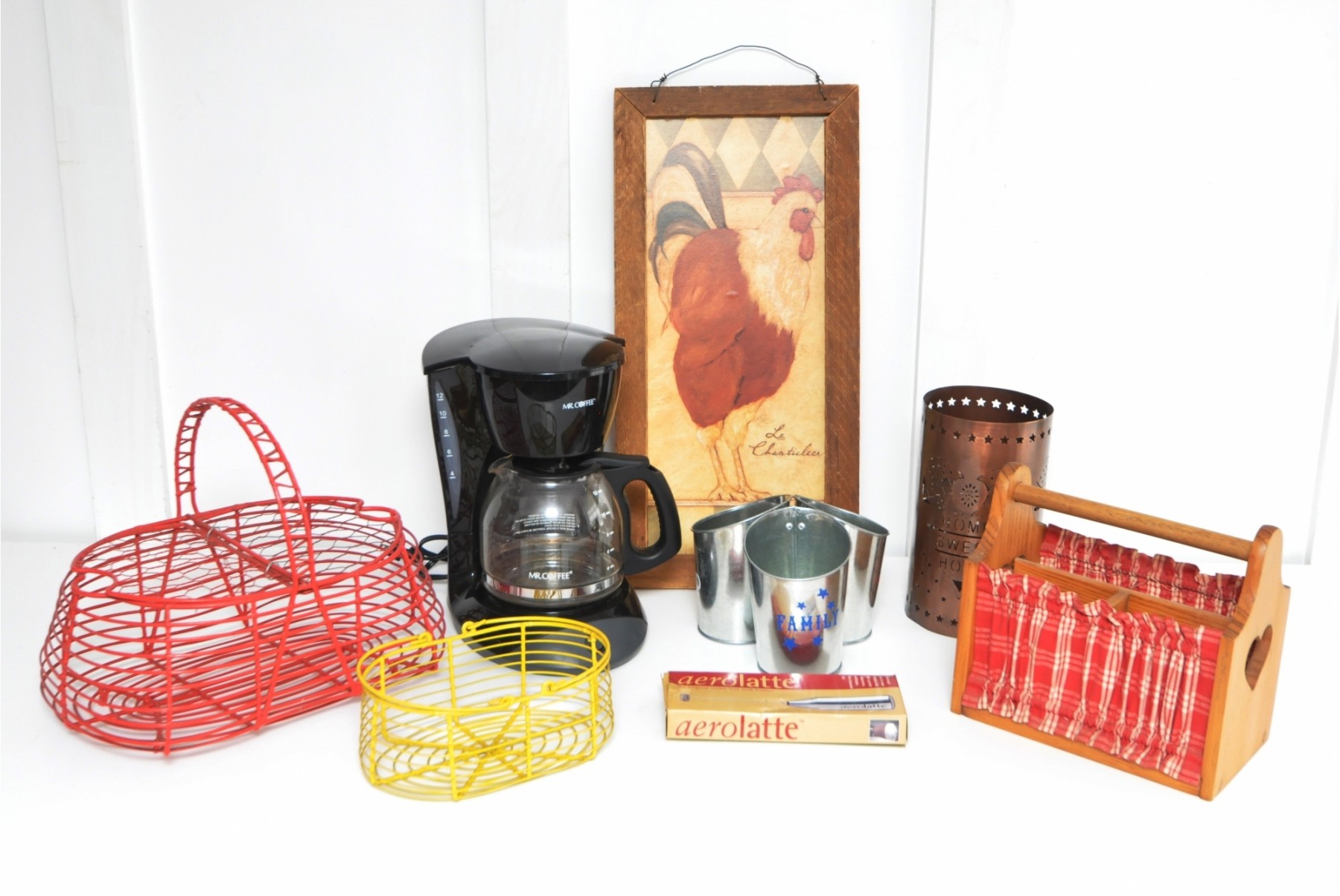 Vintage wire baskets, utensil holders, rooster print, (11" x 22") and more.