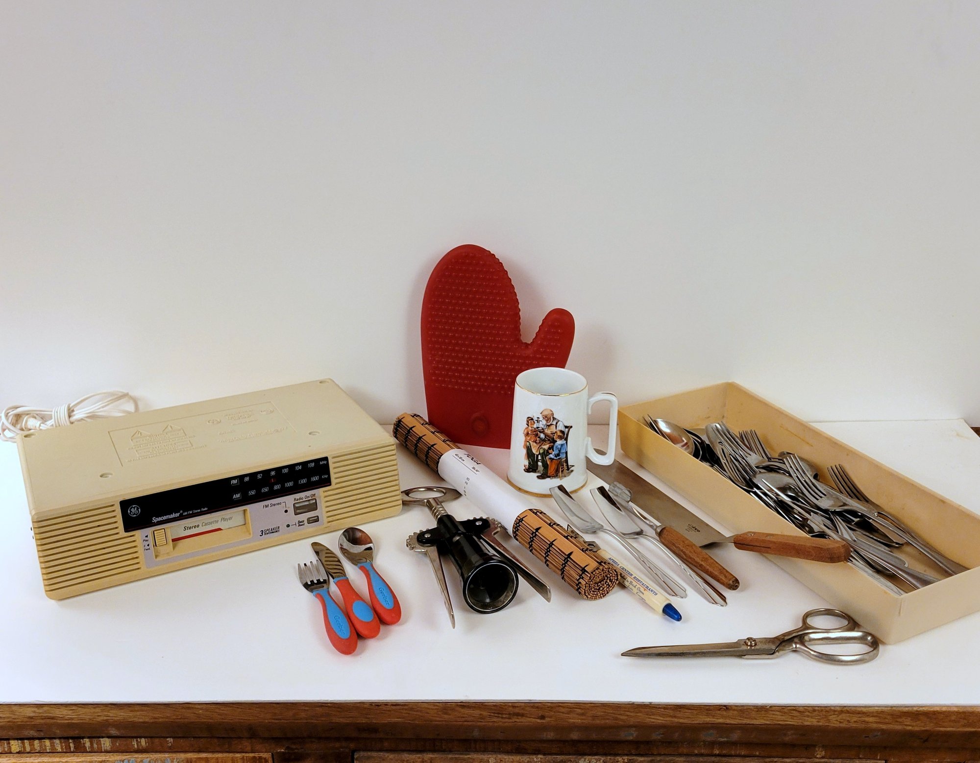 Miscellaneous flatware, silicone oven mitt, untested vintage GE radio/cassette player, and more.