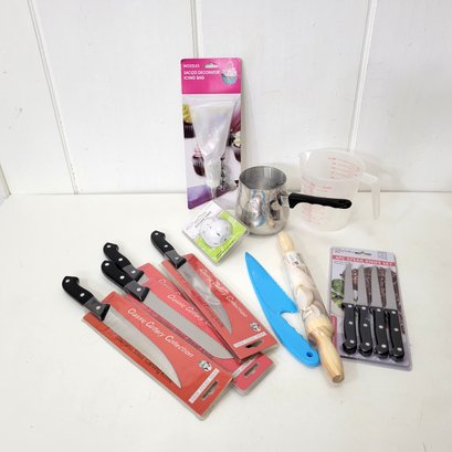 Assorted kitchen ware including knives, a timer, small rolling pin, etc.