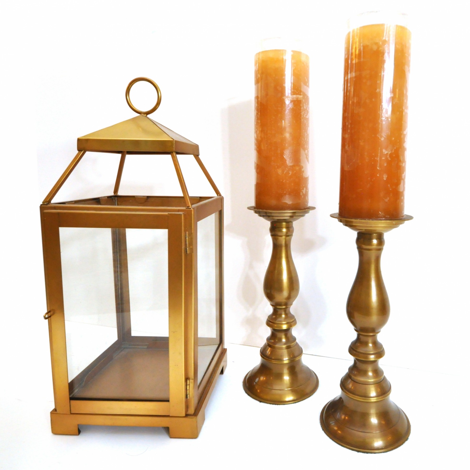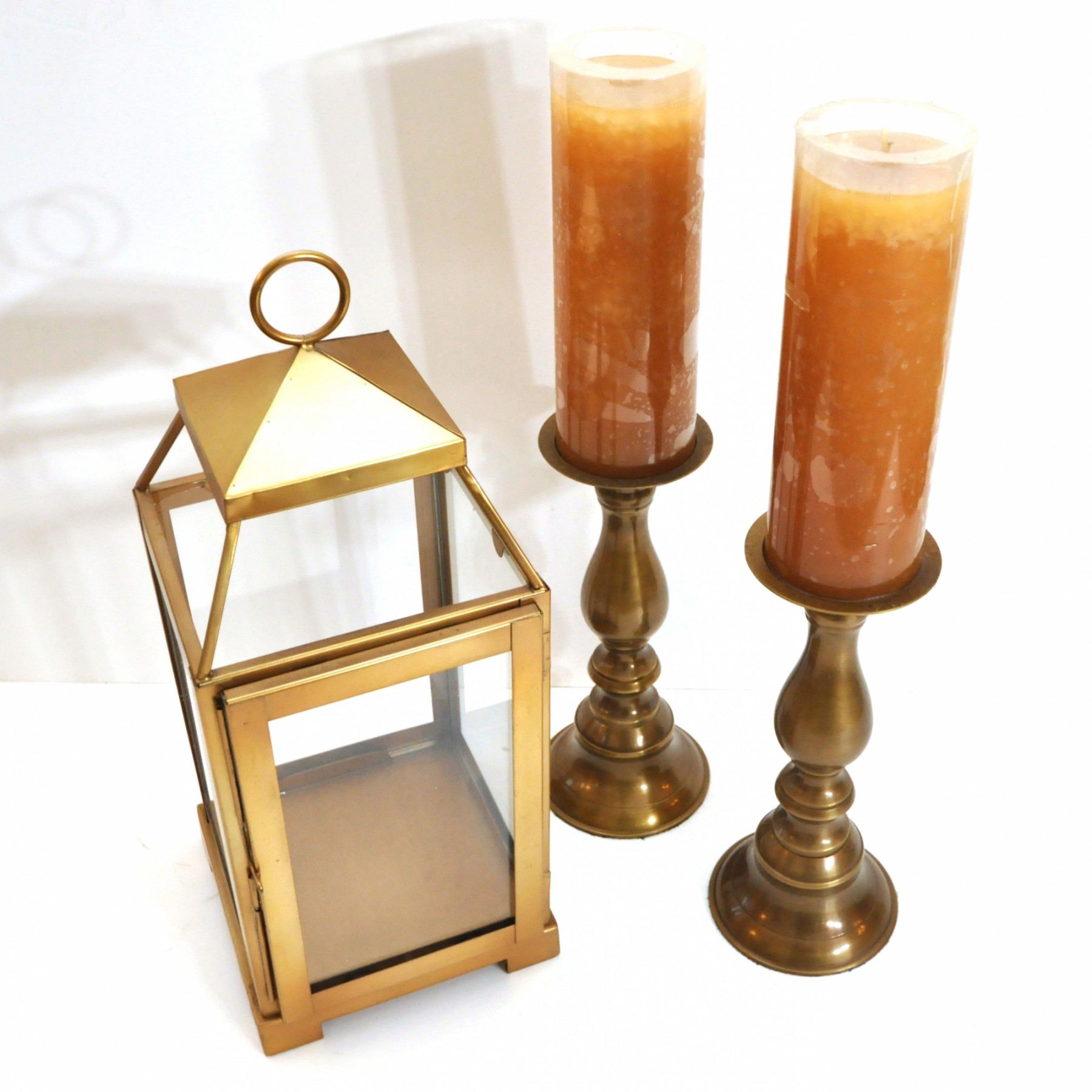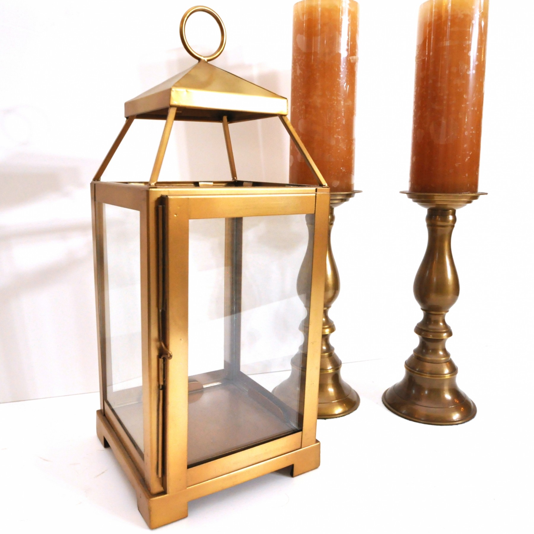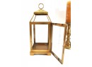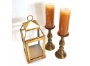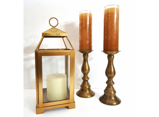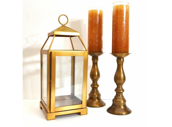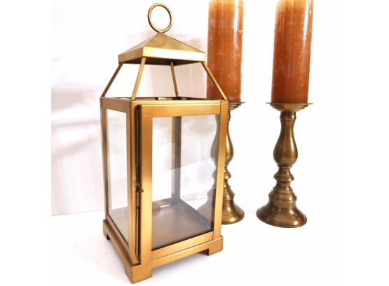 A brass lantern 7" x 7" x 18" high and metal candleholders 4" dia. x 10" high.