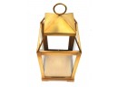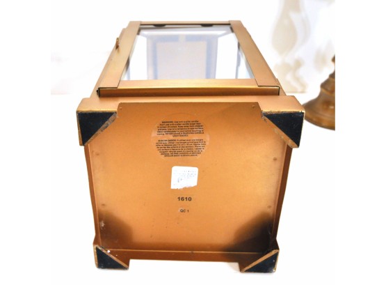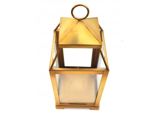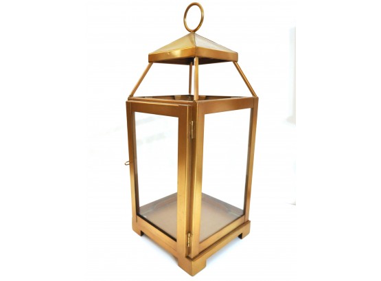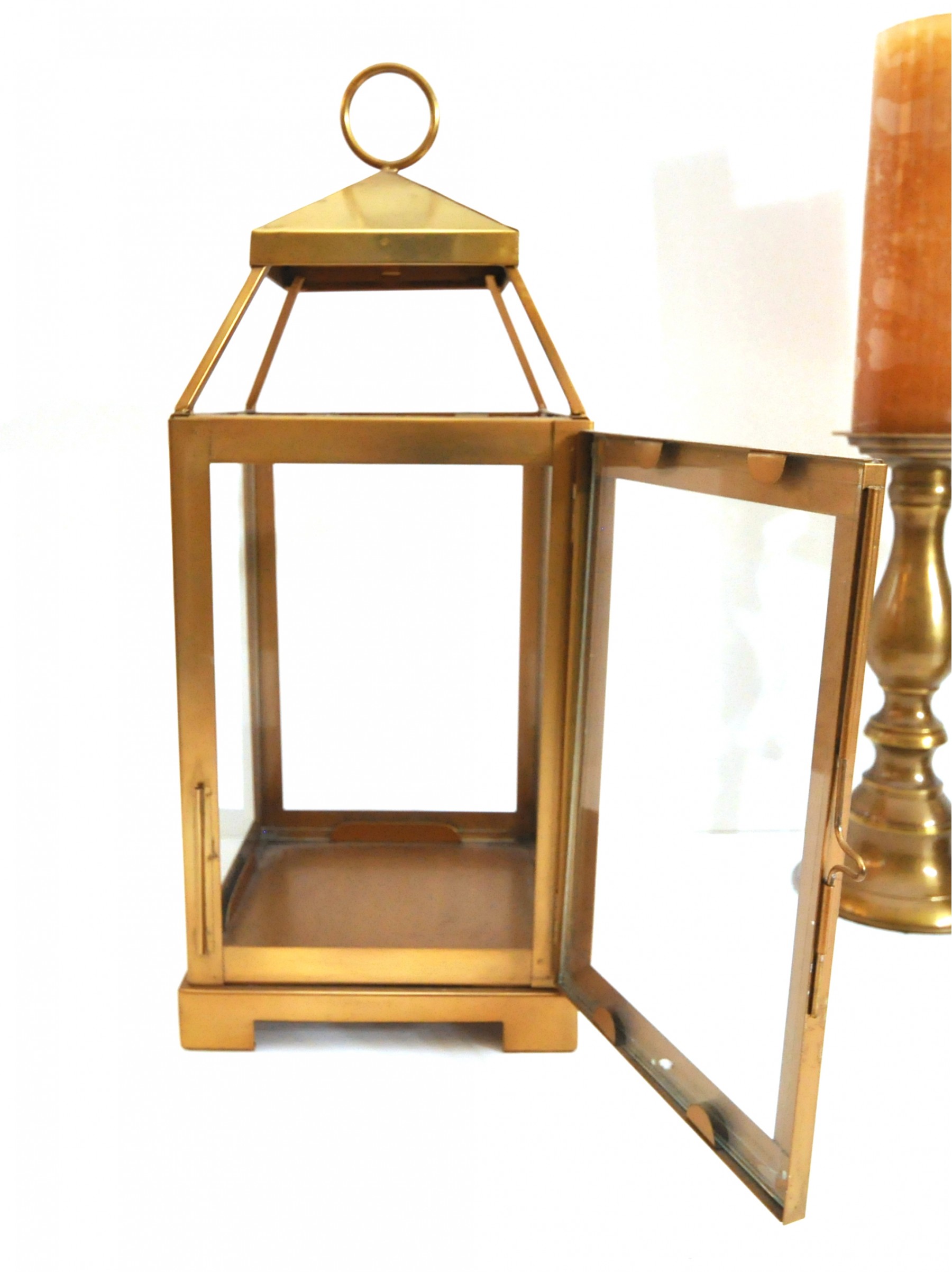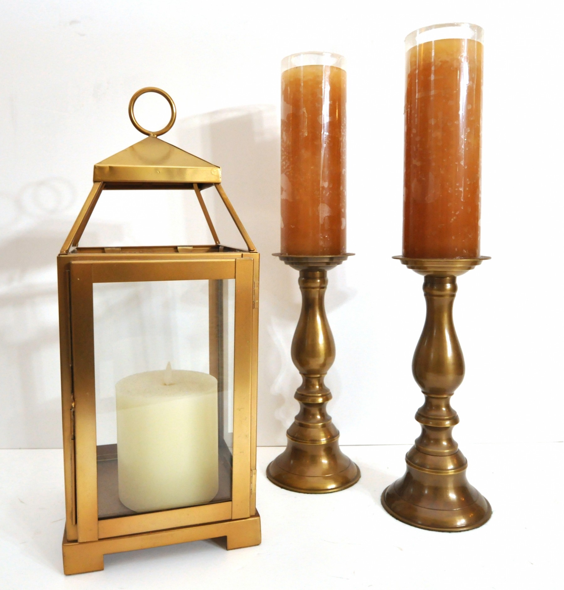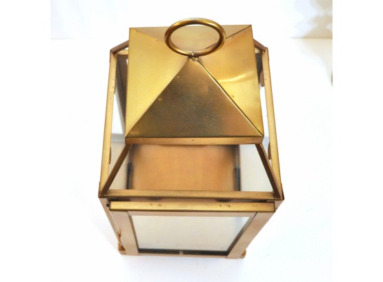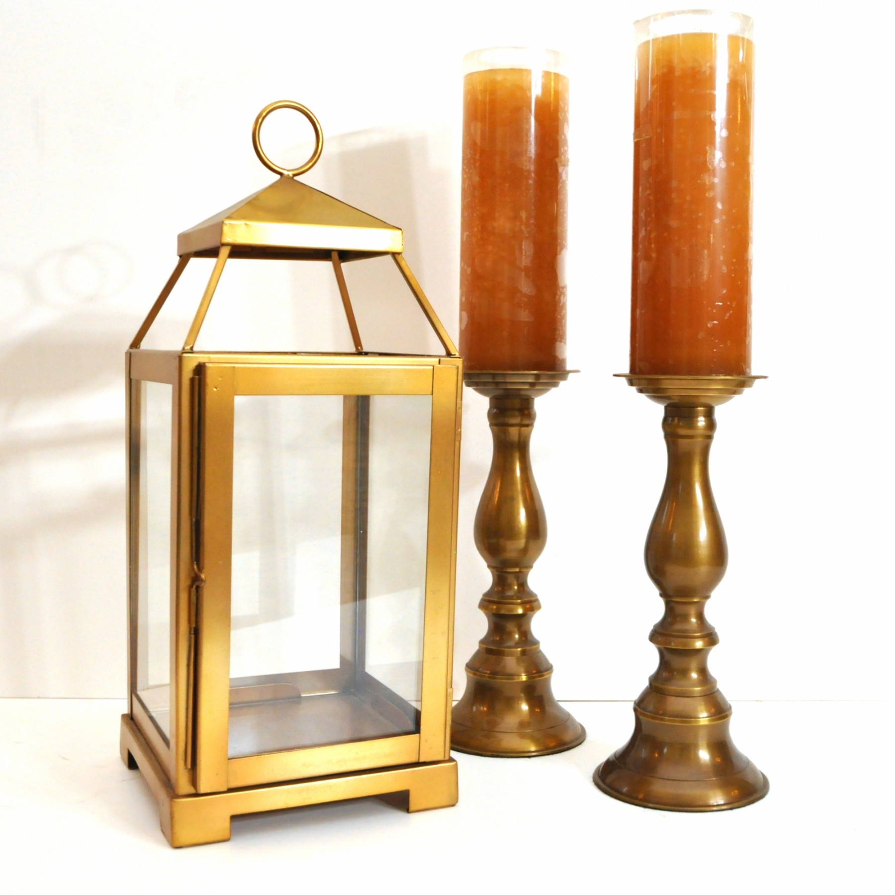A brass lantern 7" x 7" x 18" high and metal candleholders 4" dia. x 10" high.