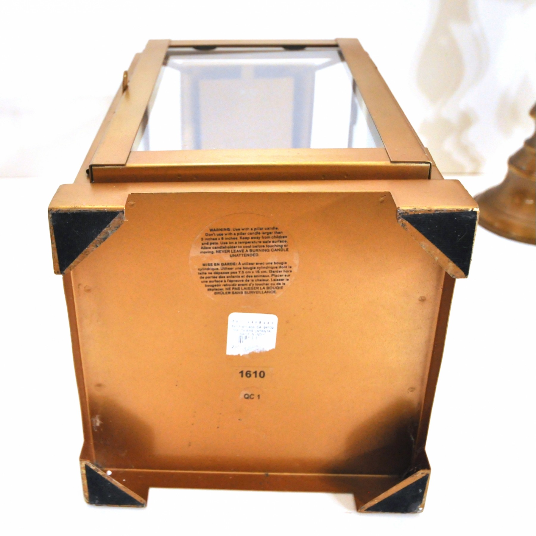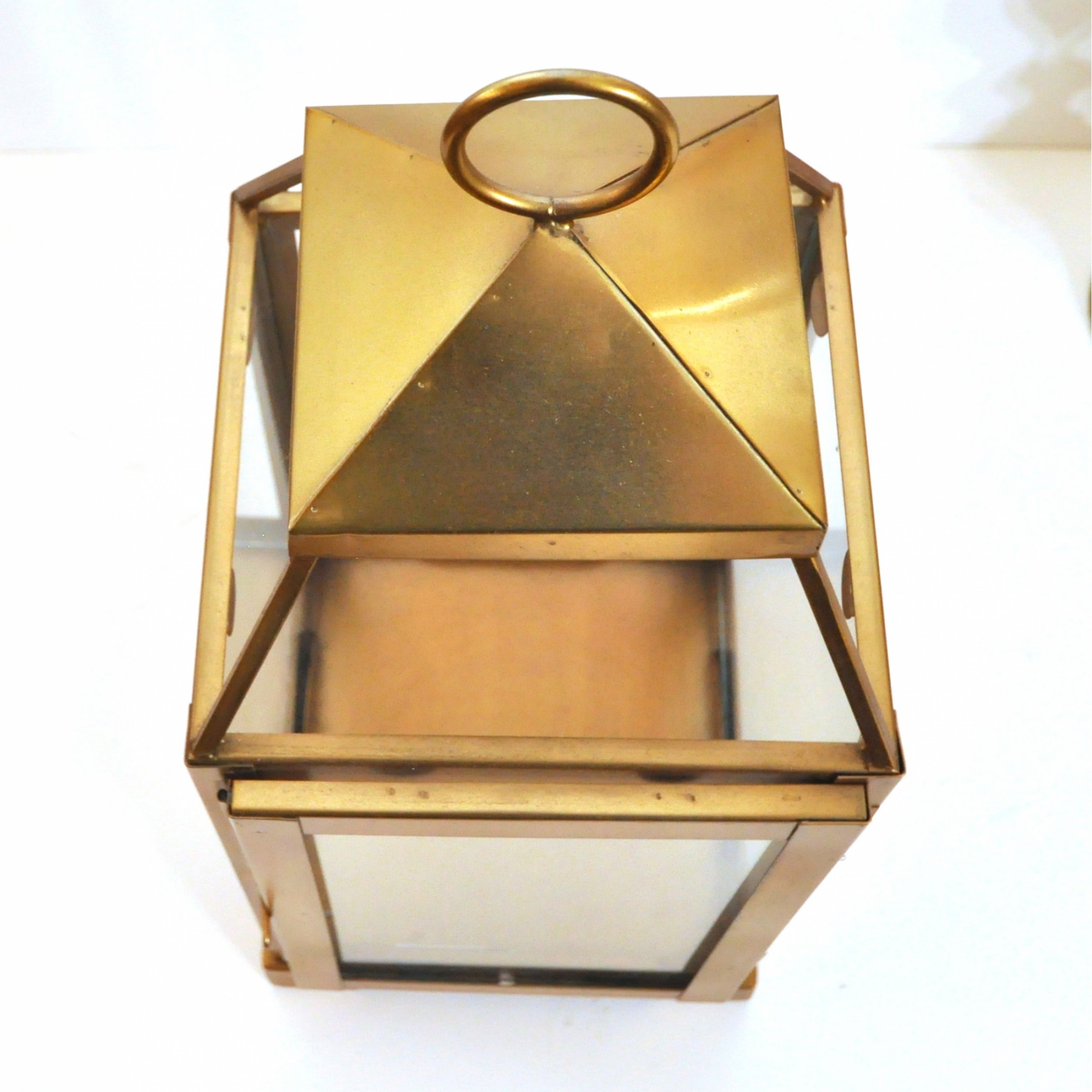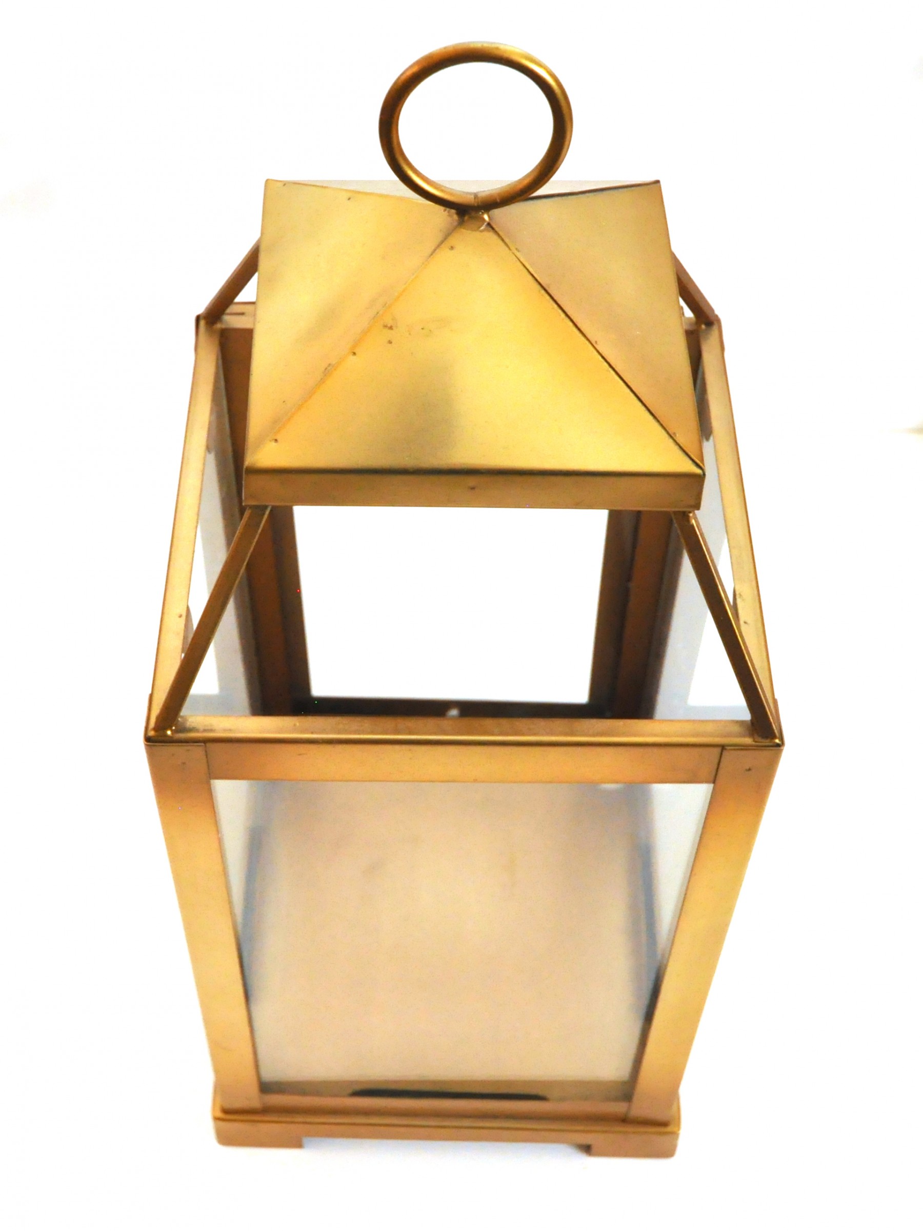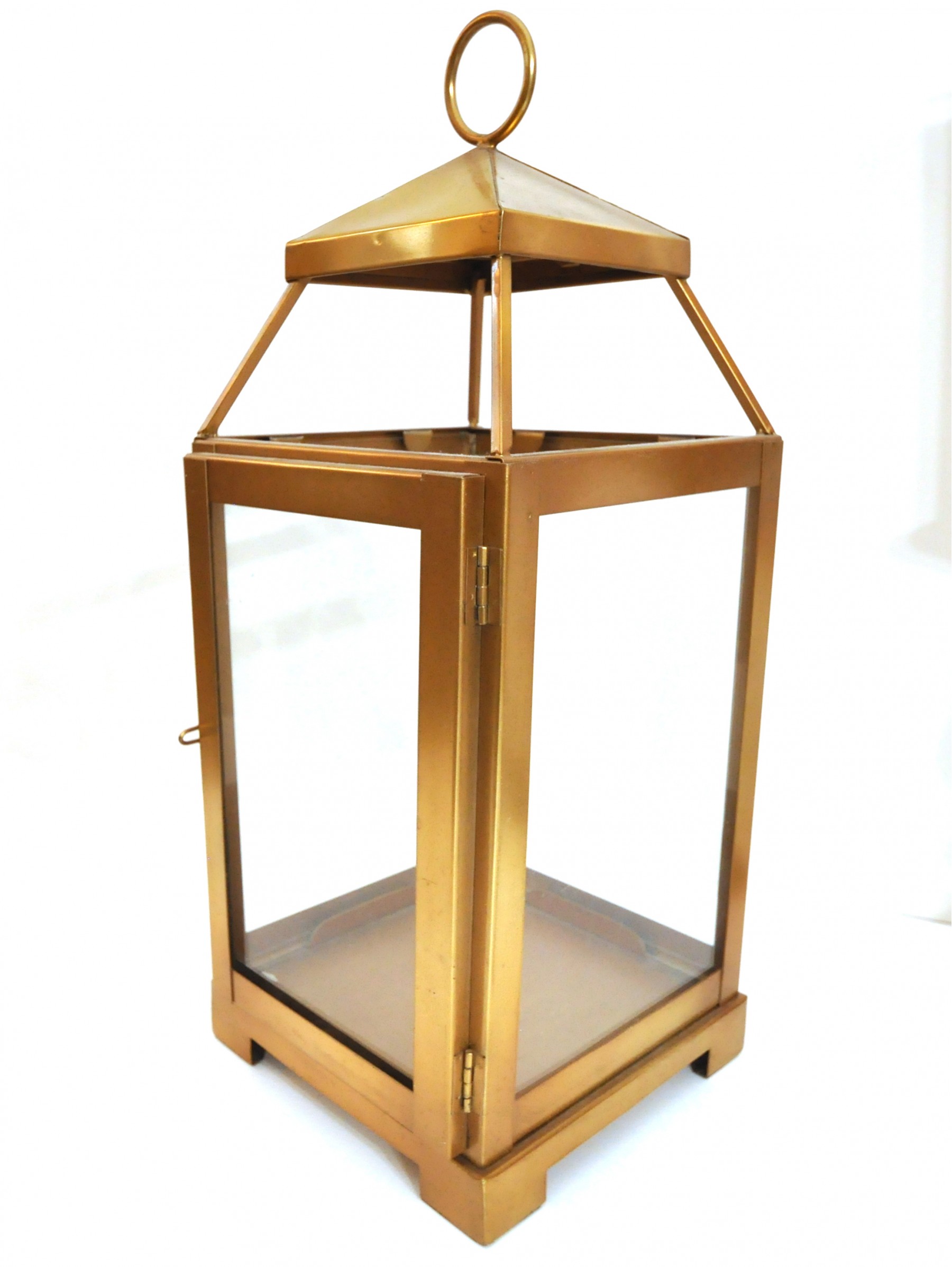 A brass lantern 7" x 7" x 18" high and metal candleholders 4" dia. x 10" high.