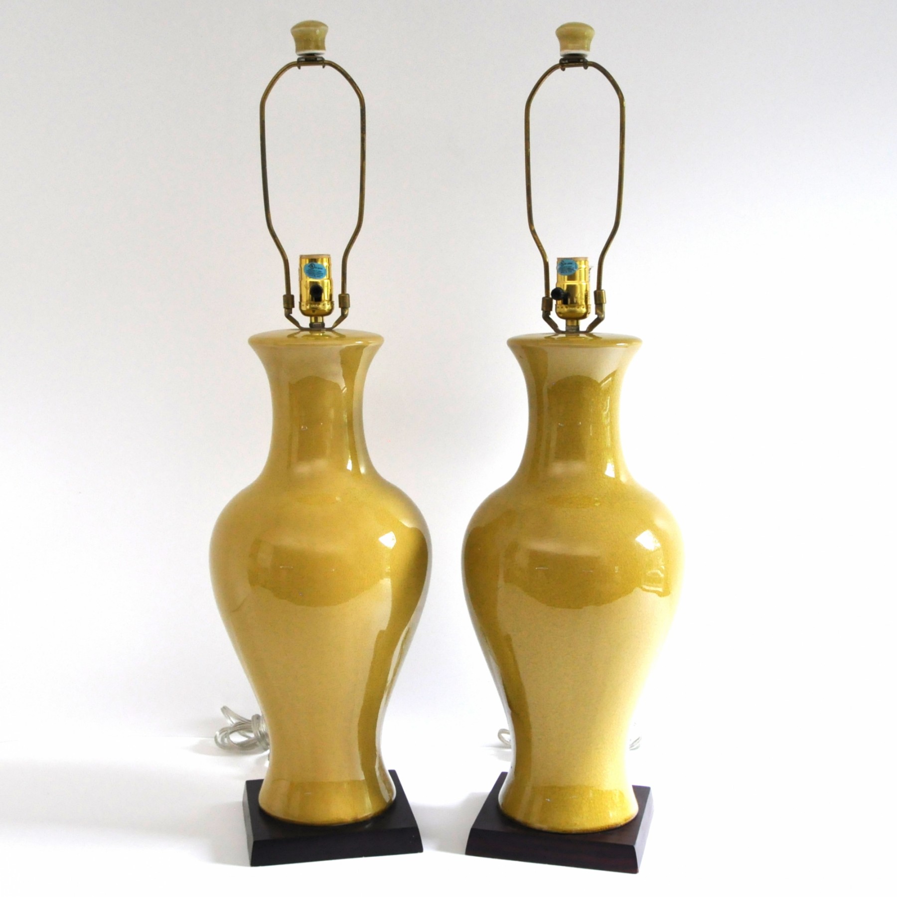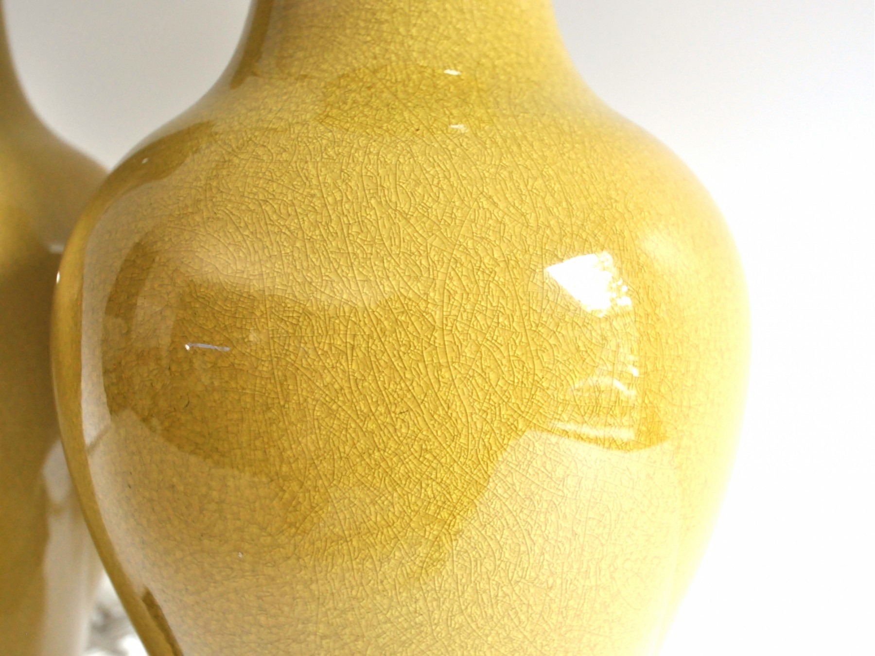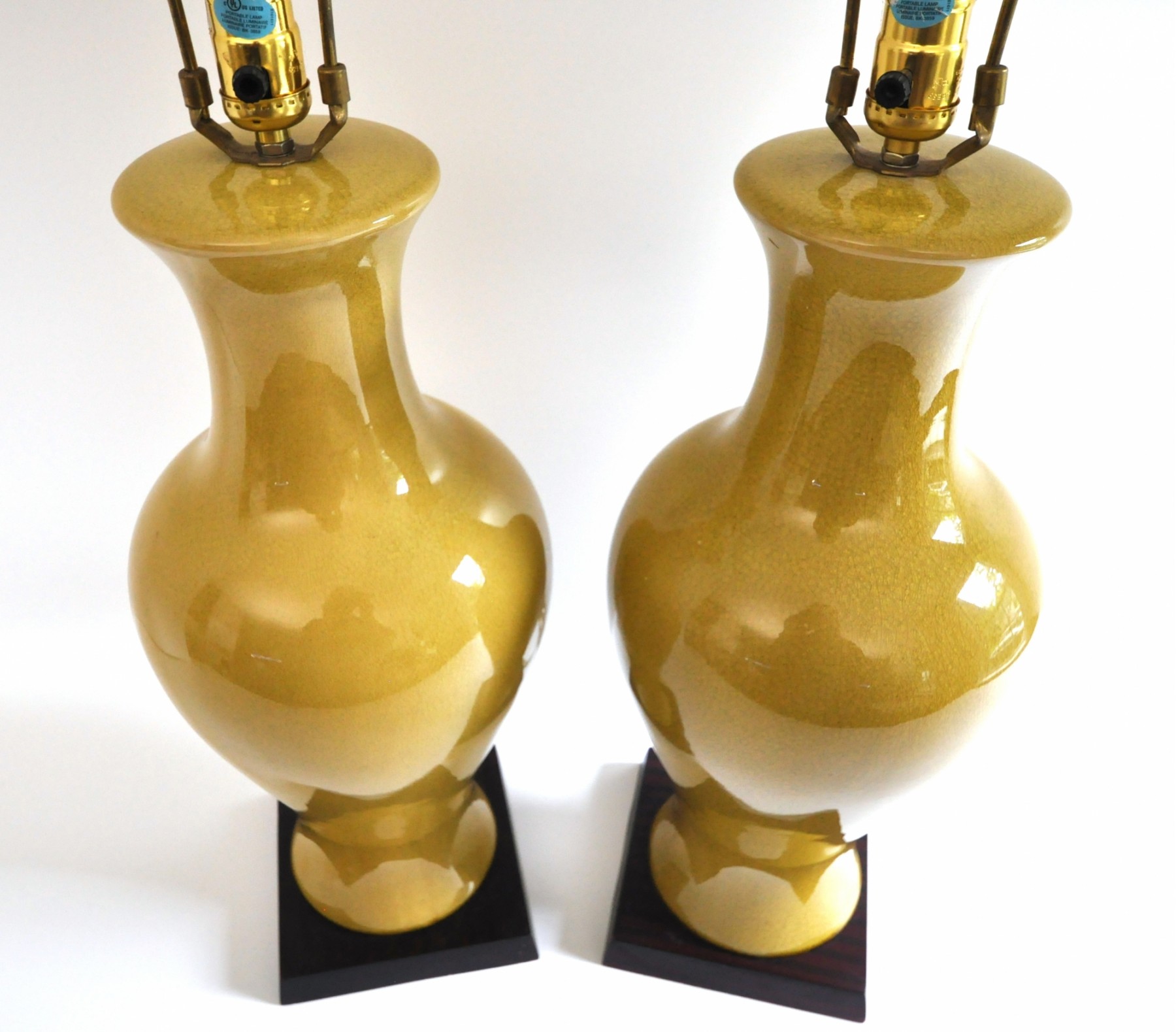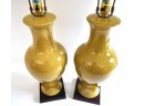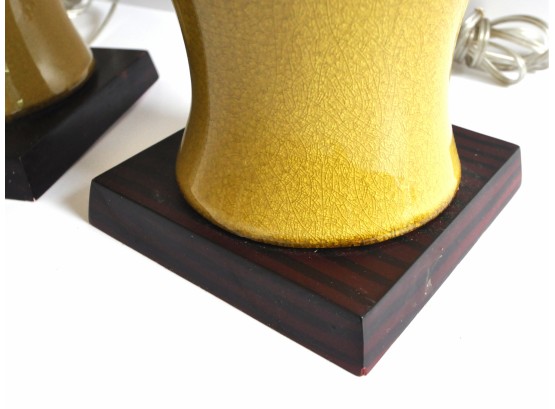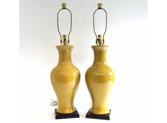 A pair of large ceramic lamps in an unusual green-yellow color. The finish has an intentional all over crackle.