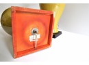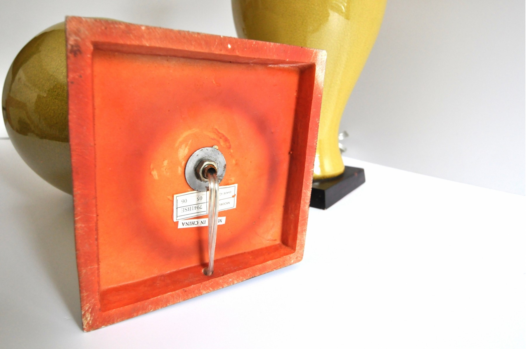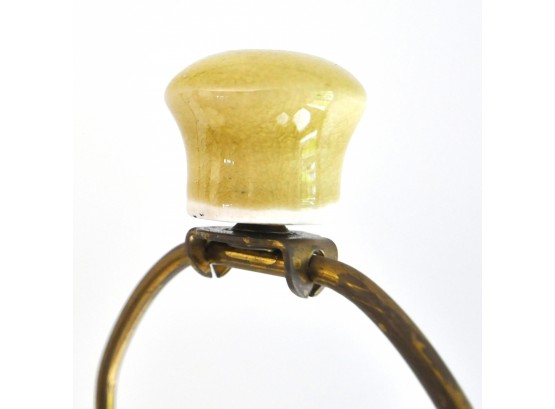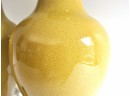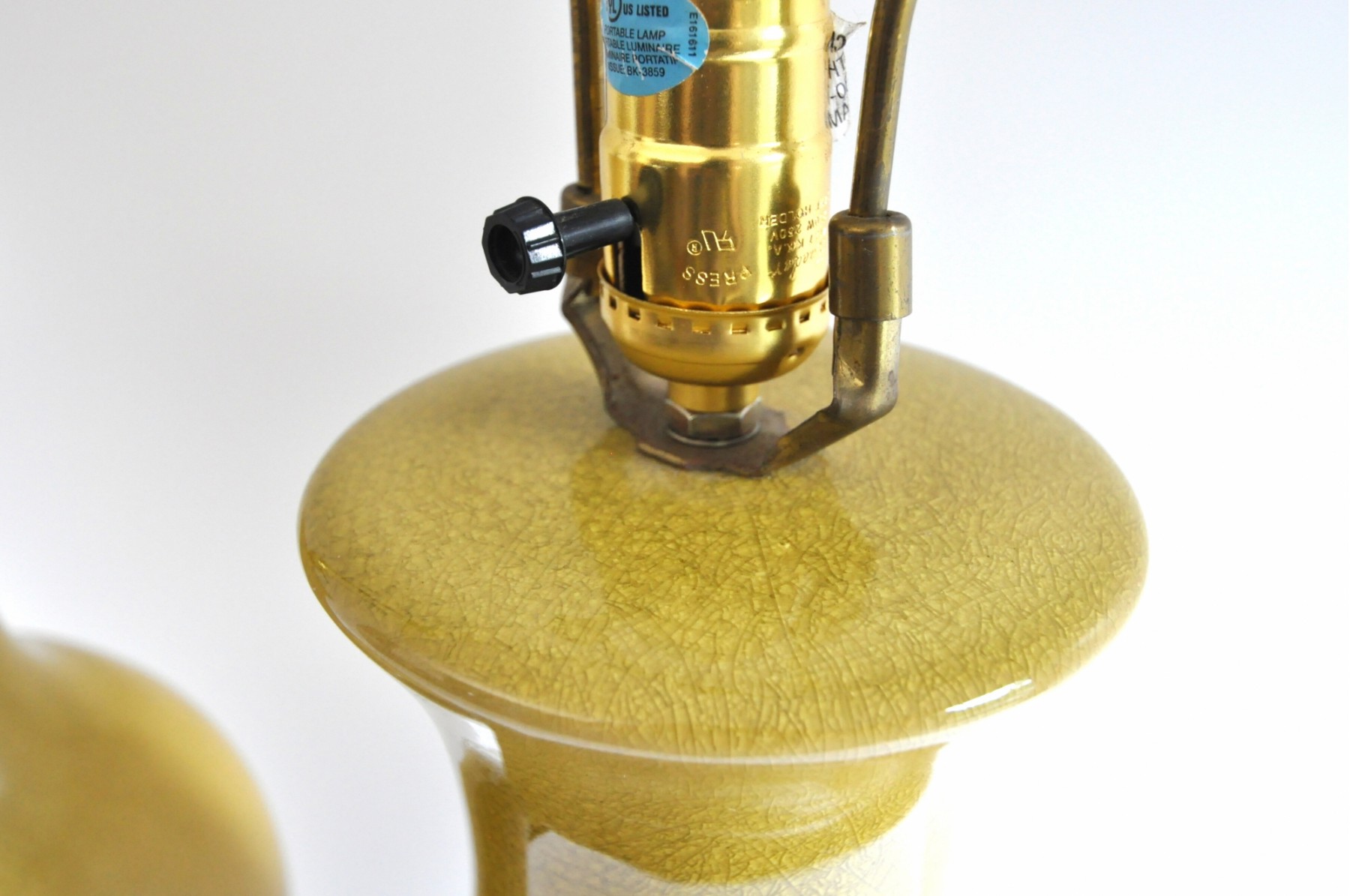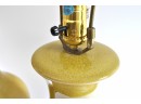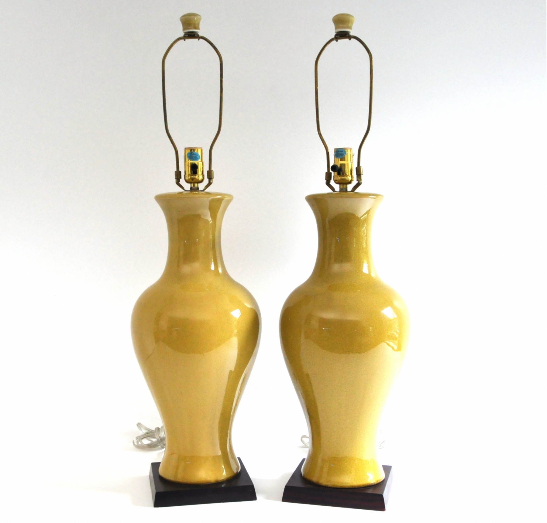 A pair of large ceramic lamps in an unusual green-yellow color. The finish has an intentional all over crackle.