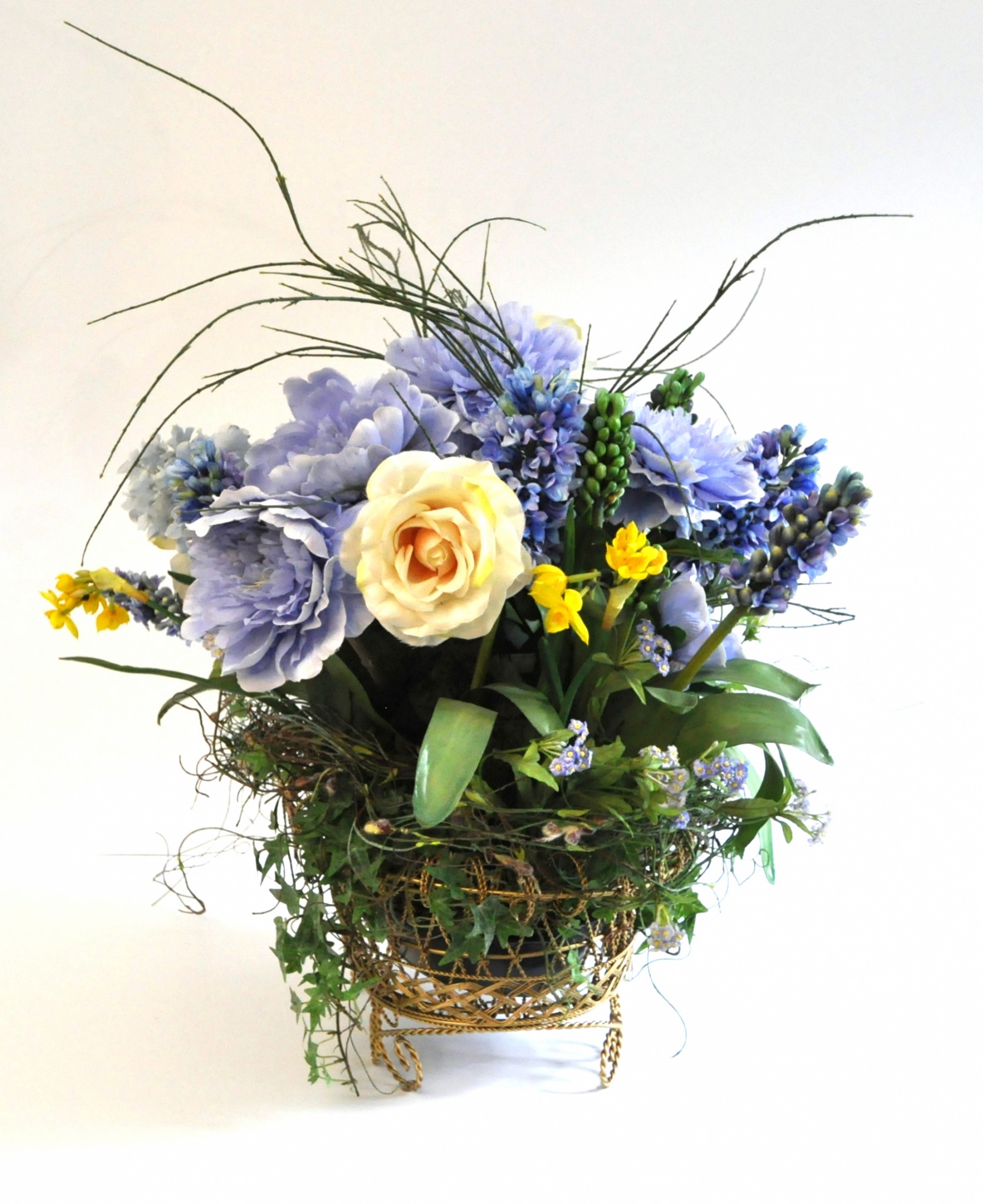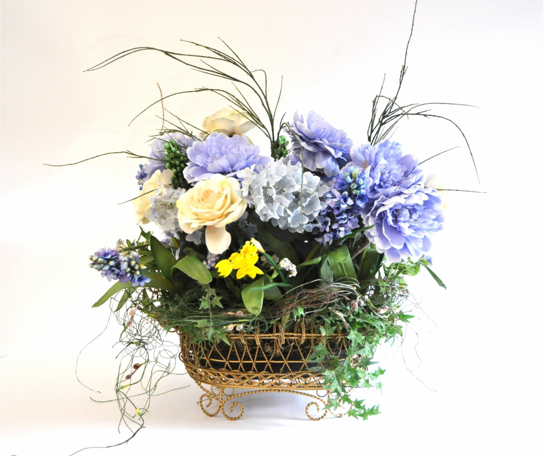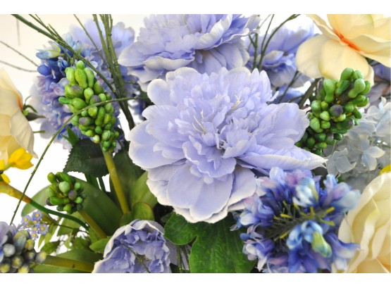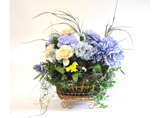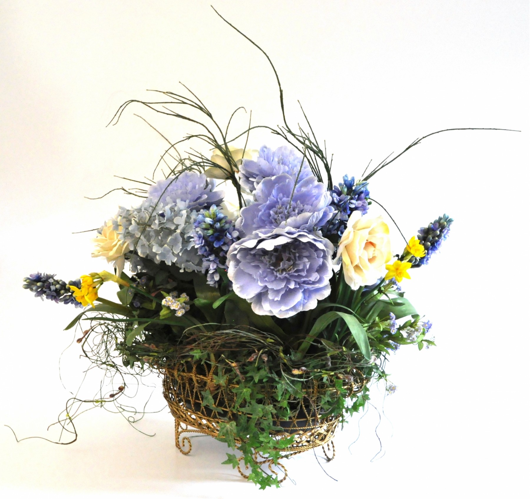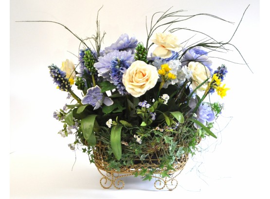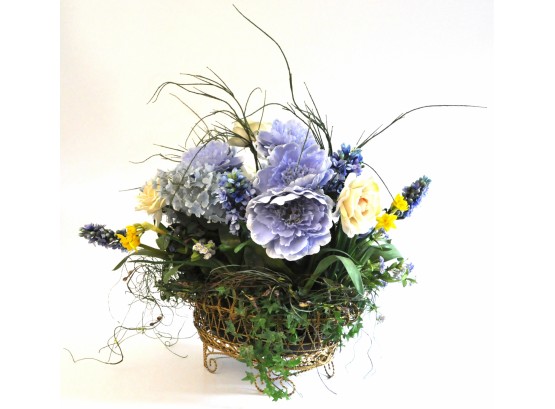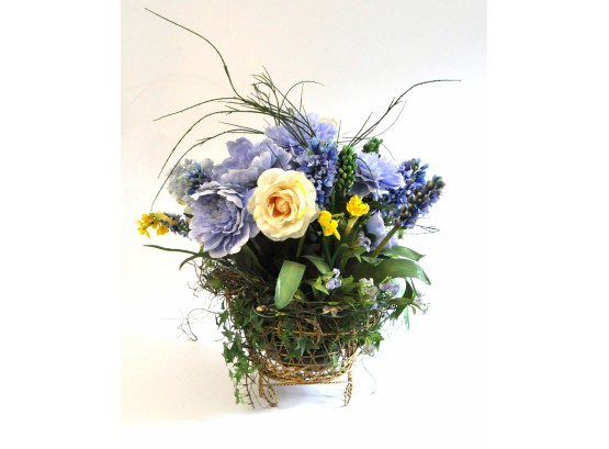 Lavender-blue, cream and yellow silk flowers in a wire basket with ivy. A stunning piece!