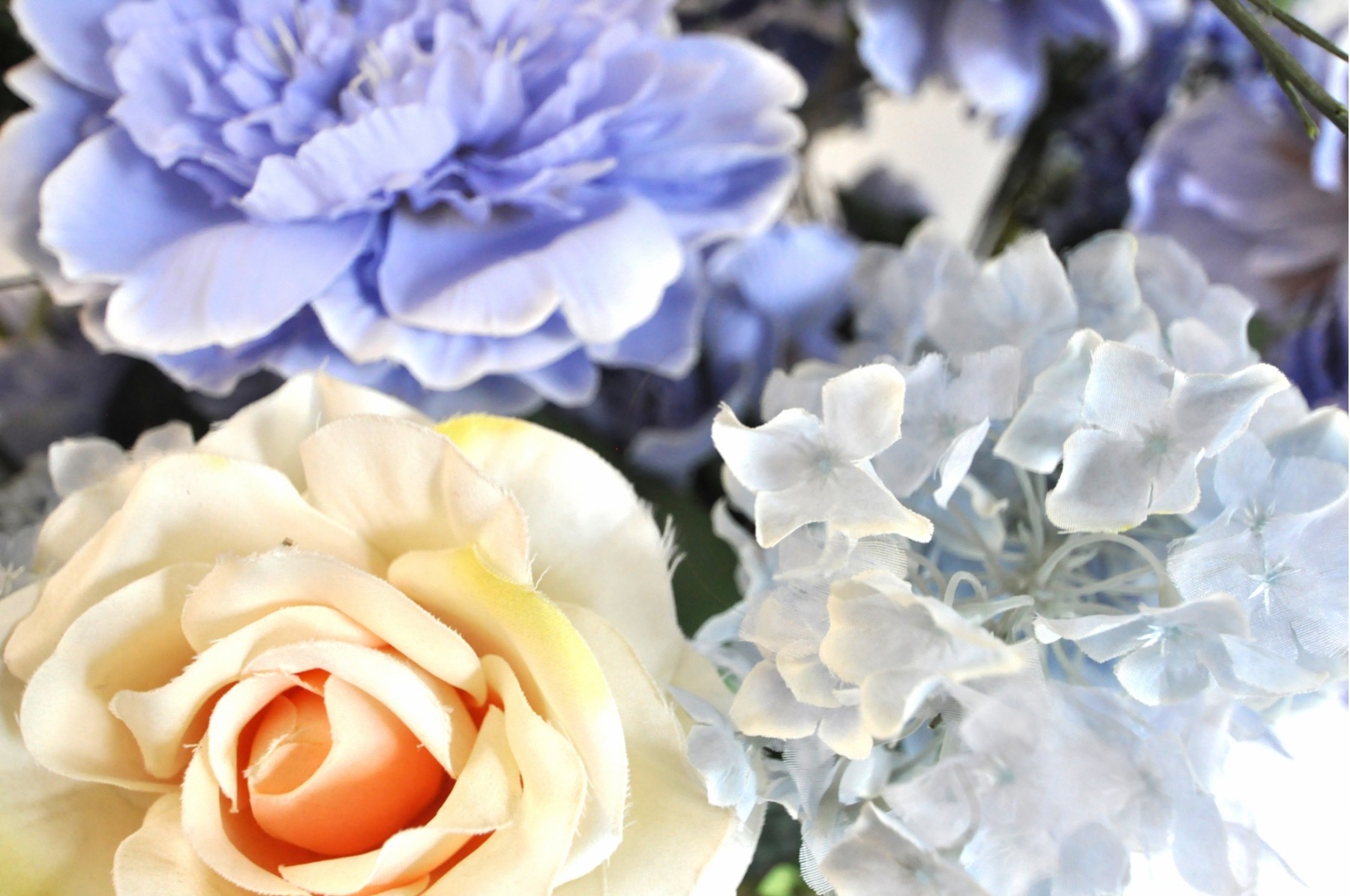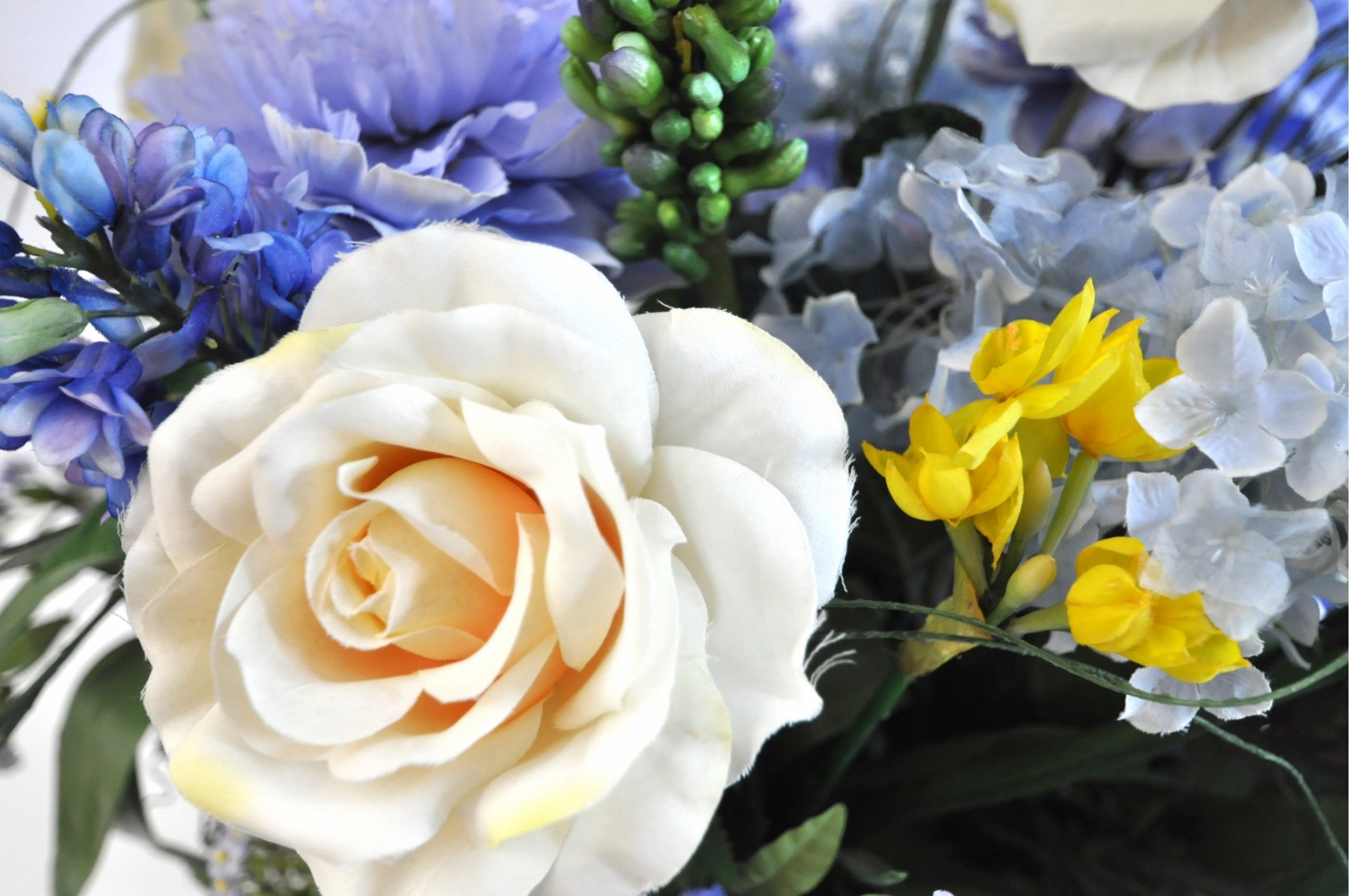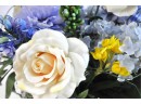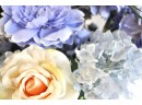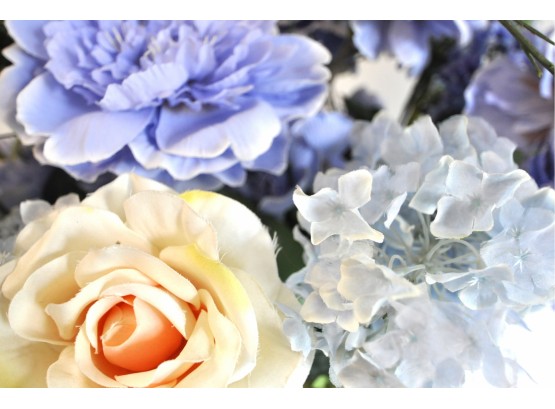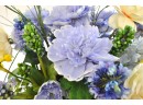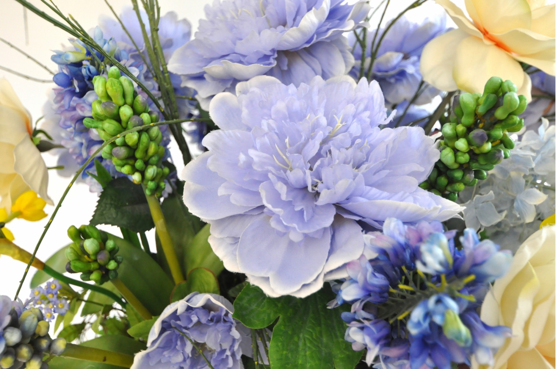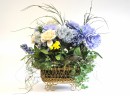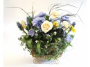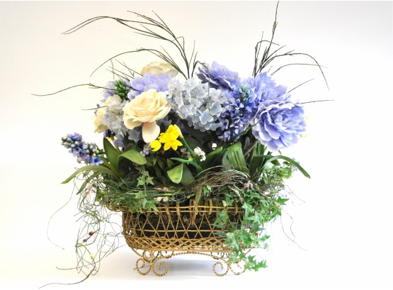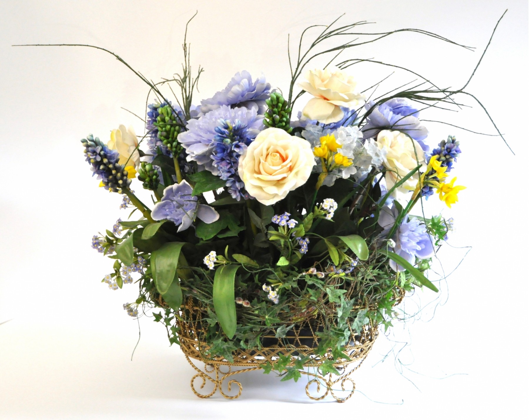 Lavender-blue, cream and yellow silk flowers in a wire basket with ivy. A stunning piece!