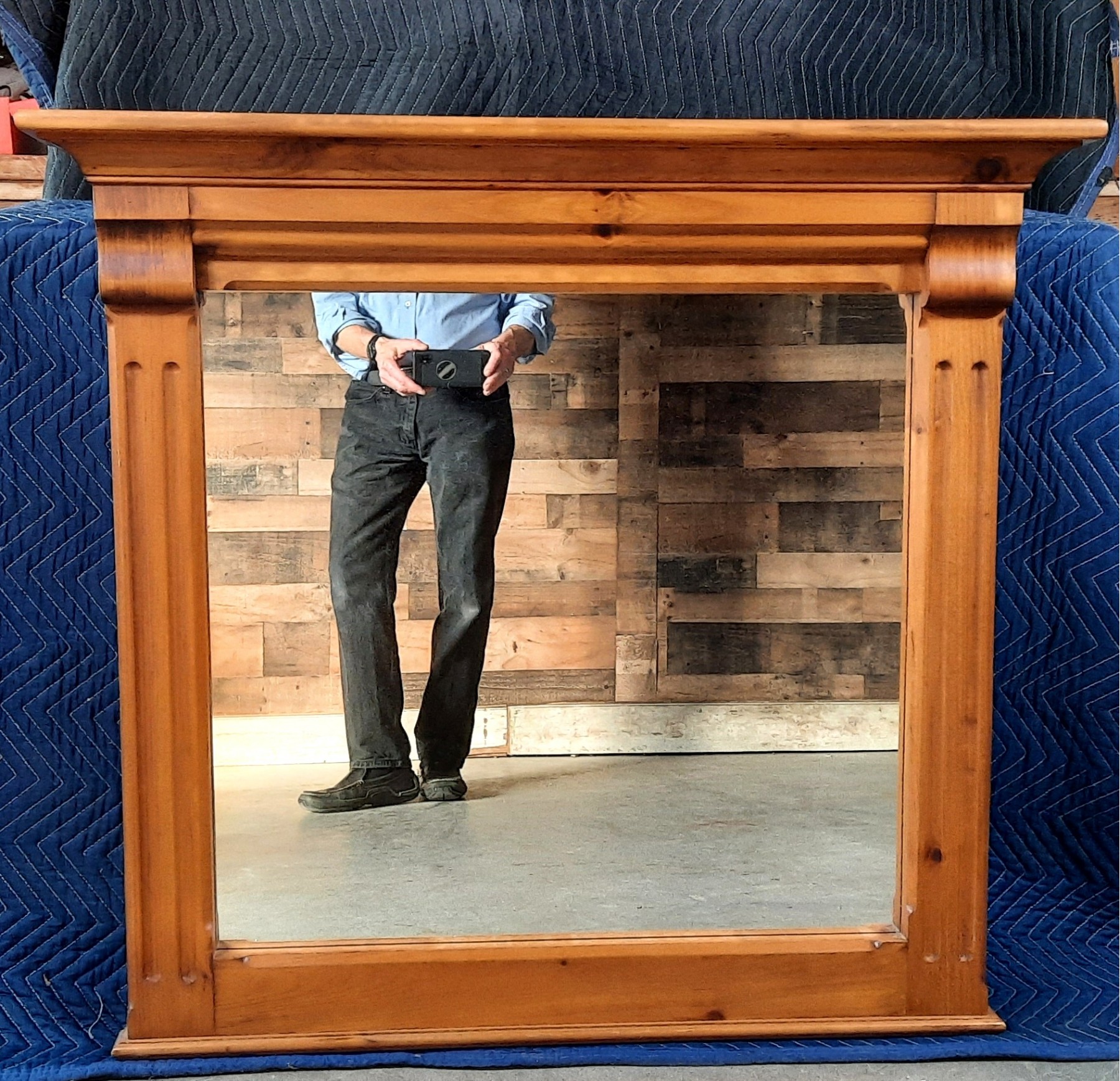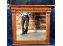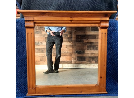 A large pine mirror with crown molding. It measures 40" wide x 38" high.