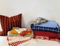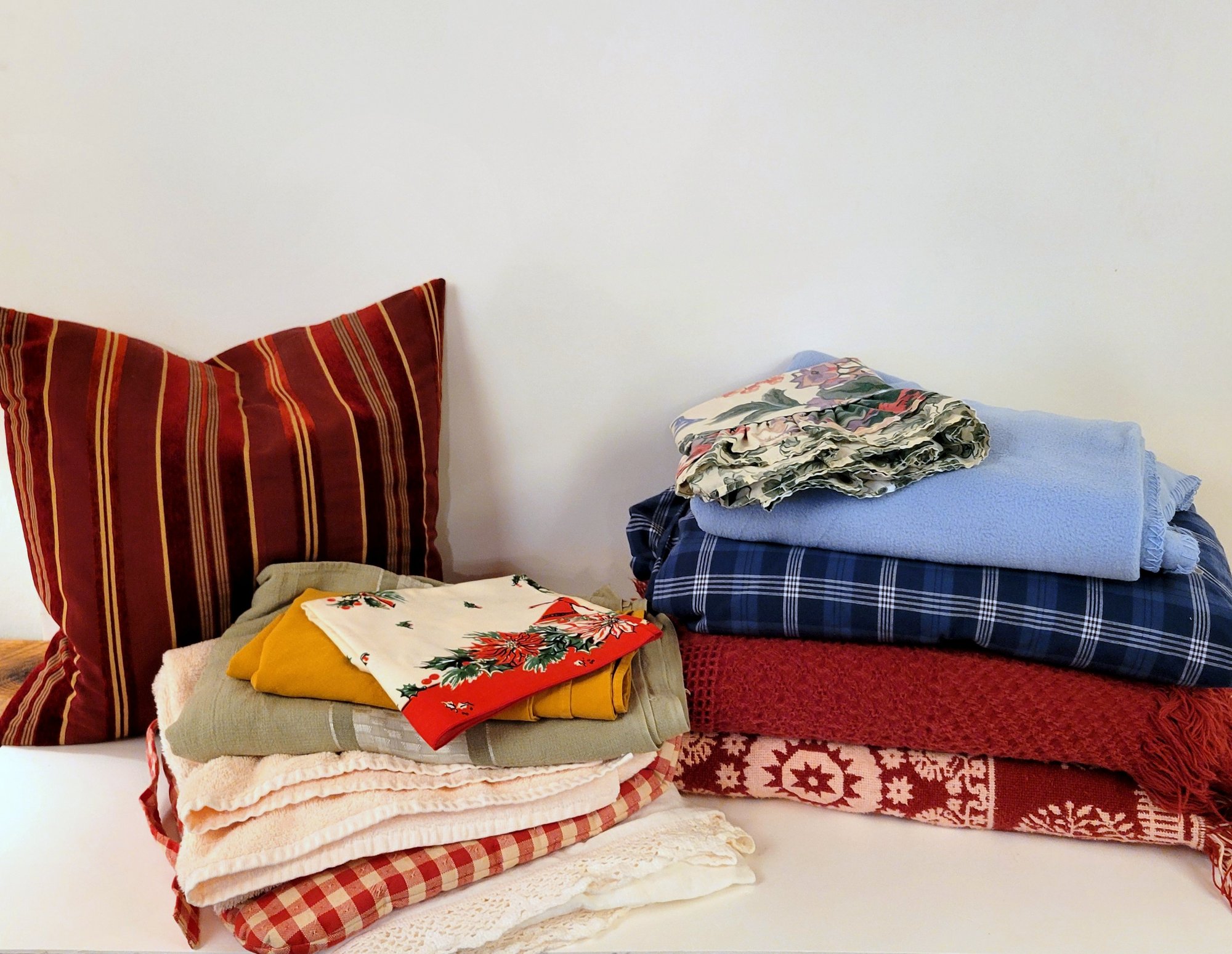 Cotton afghans, twin duvet cover, vintage tablecloths, and miscellaneous.