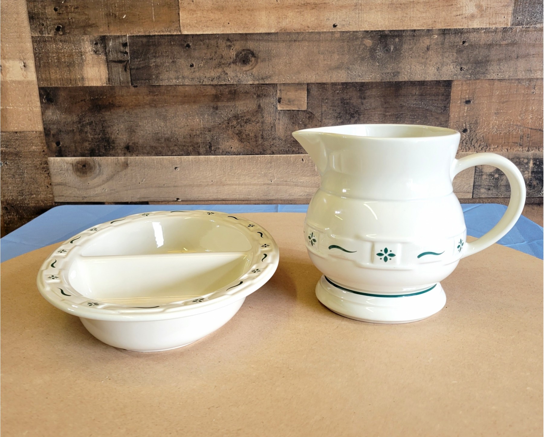Longaberger Pottery Woven Traditions Green Large Pitcher And Divided Dish