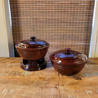 Ovenproof, 8 1/2" diameter x 5" high. Two casseroles with lids, one hard to find stand.