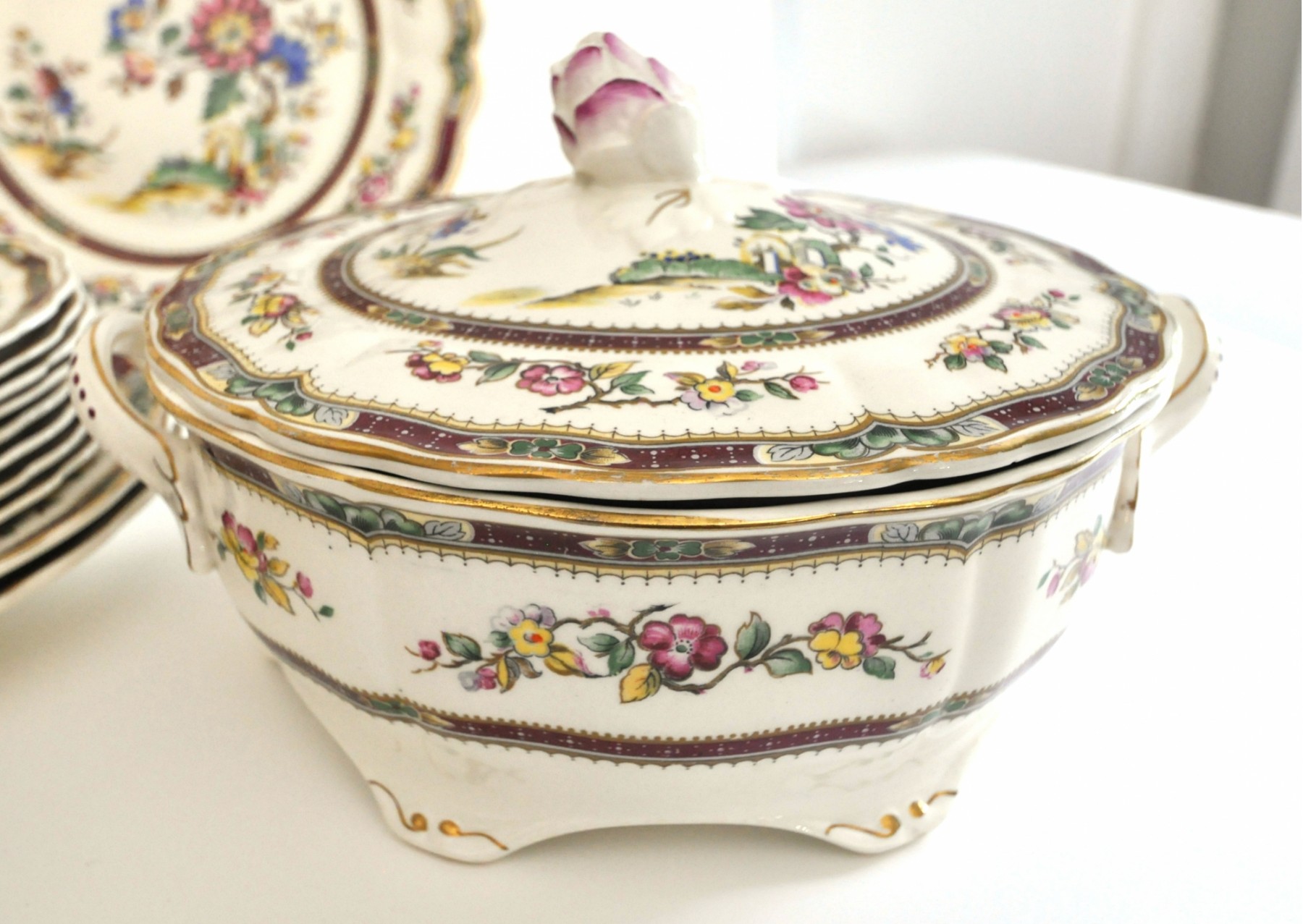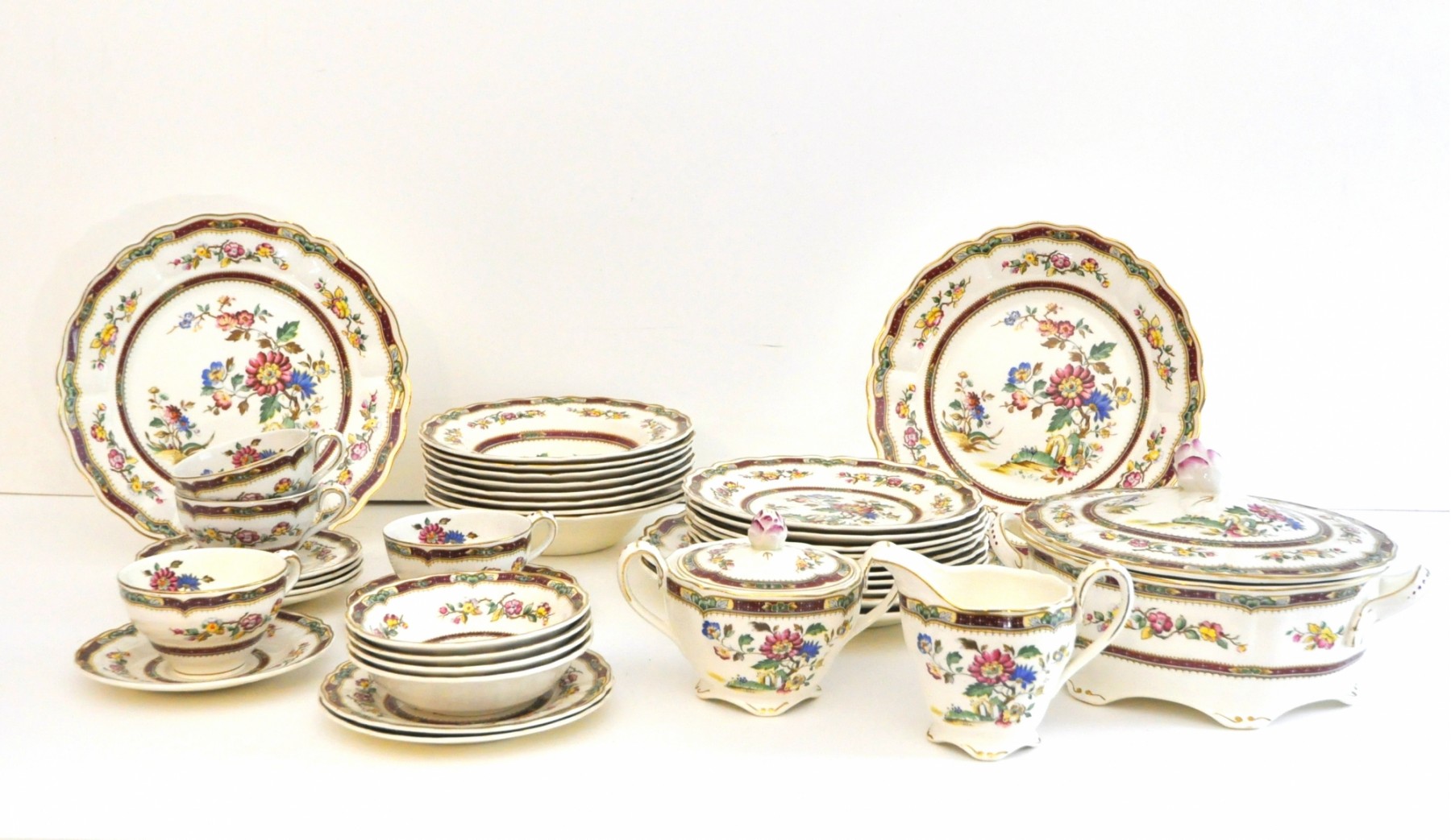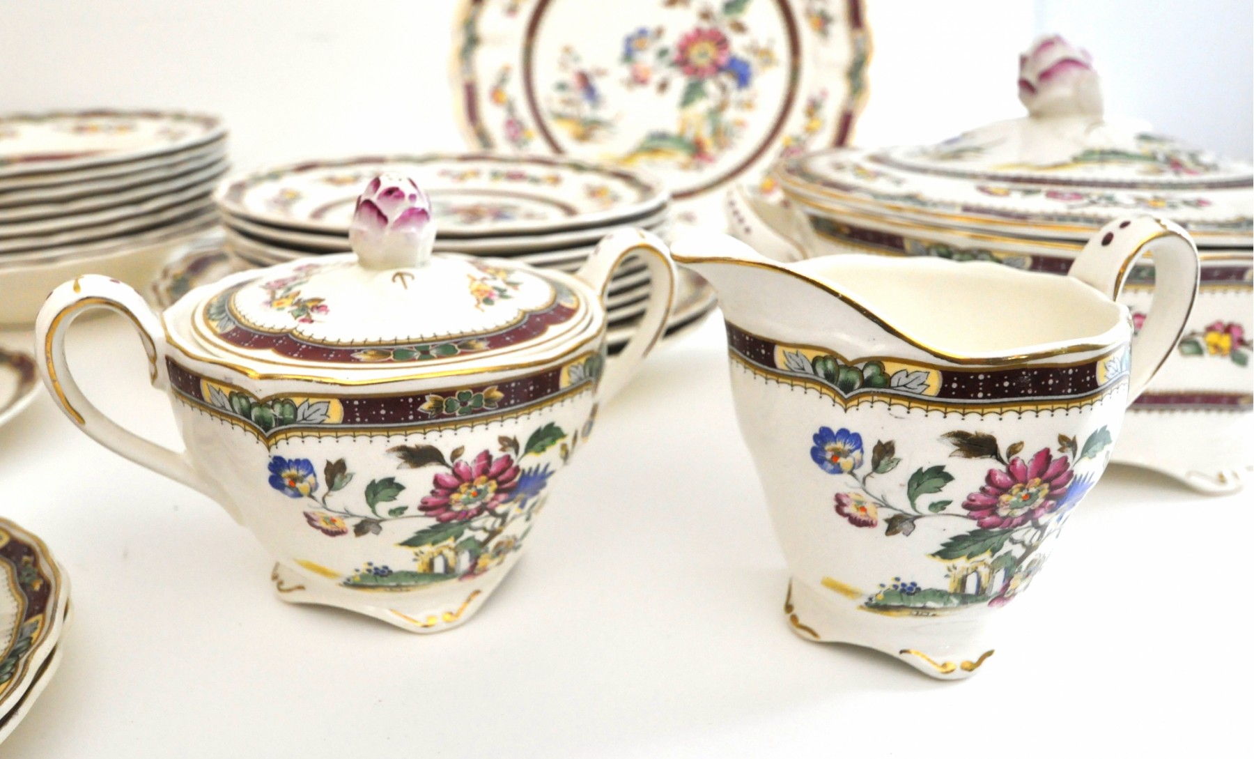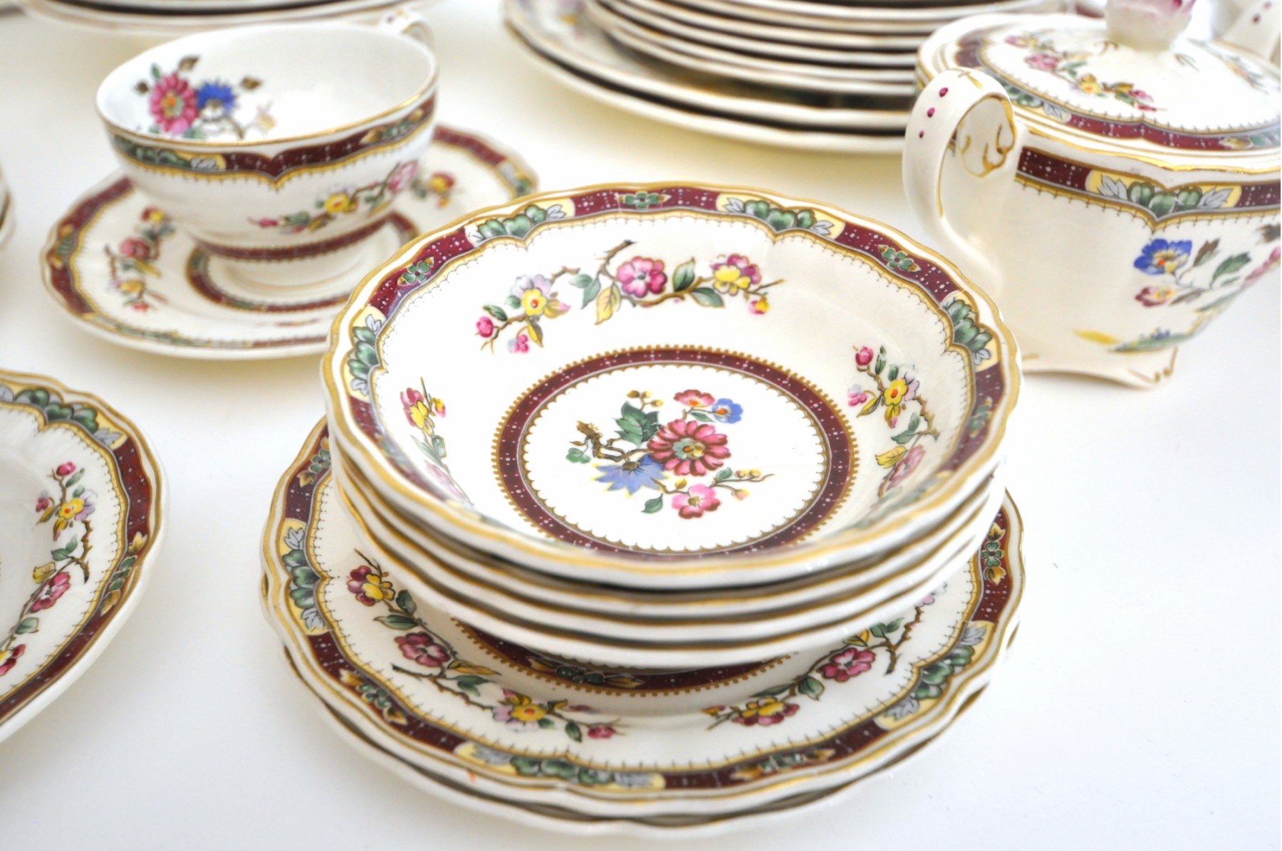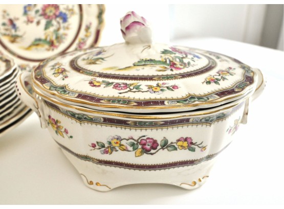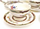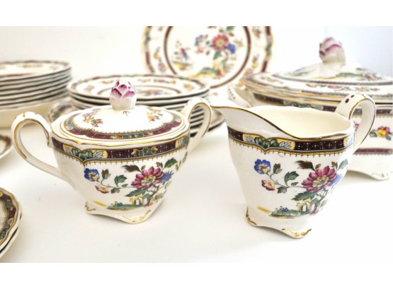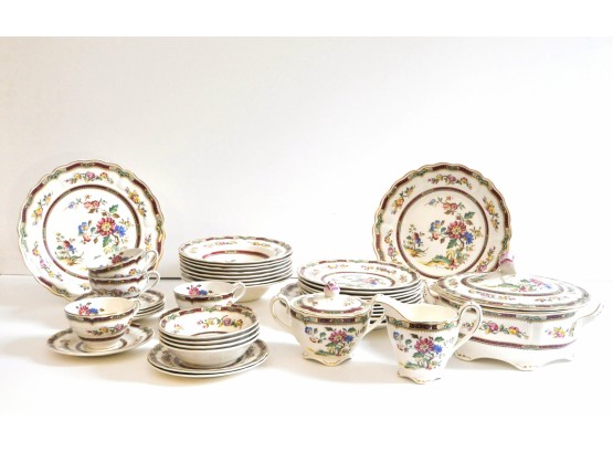 4- 10" dinner plates, 8 - 8" plates, 2 - 6" plates, 6 - saucers, 4 teacups, sugar and creamer, covered serving bowl, 8 - 8" soup bowls, 4 - 5" bowls