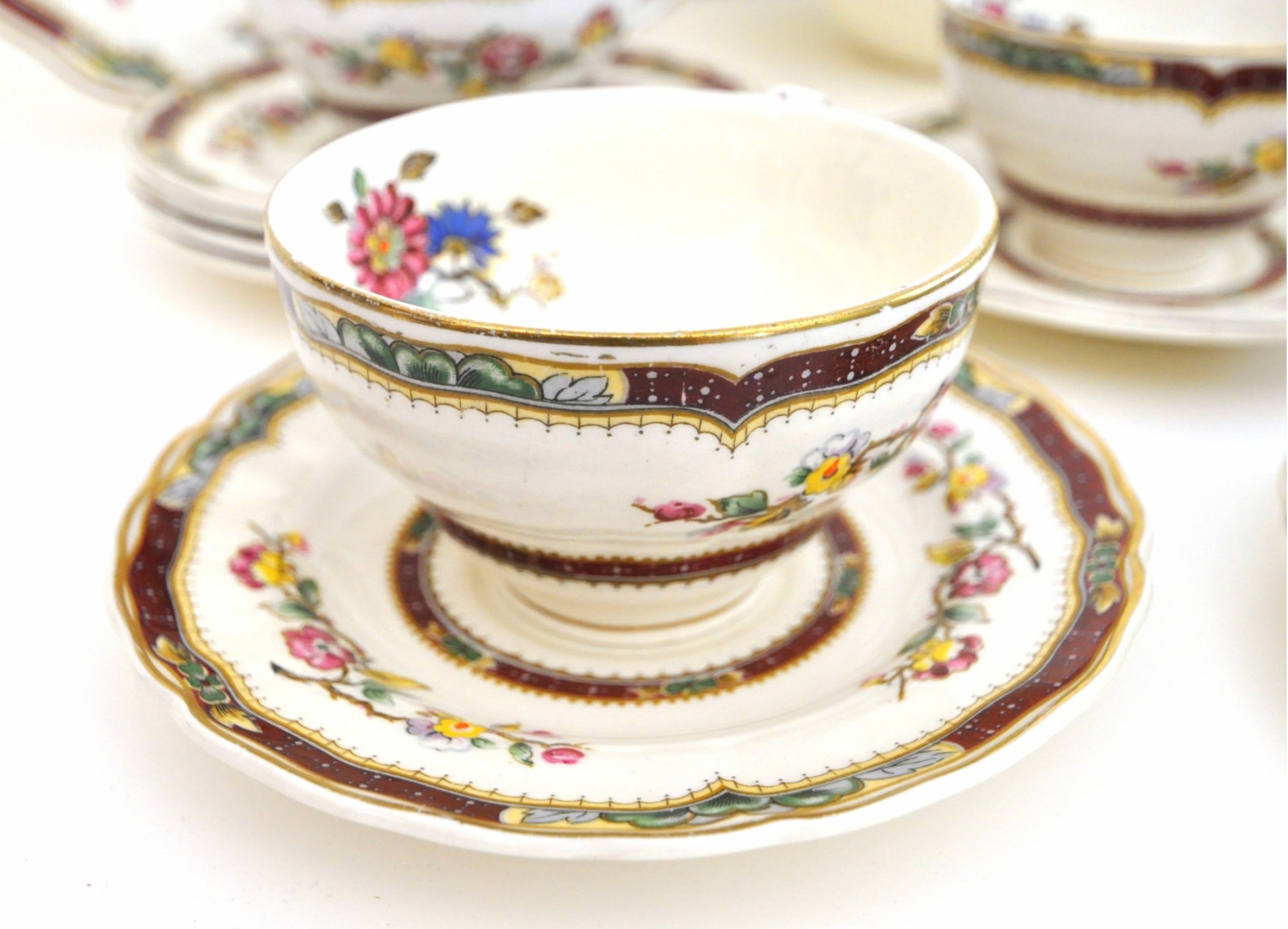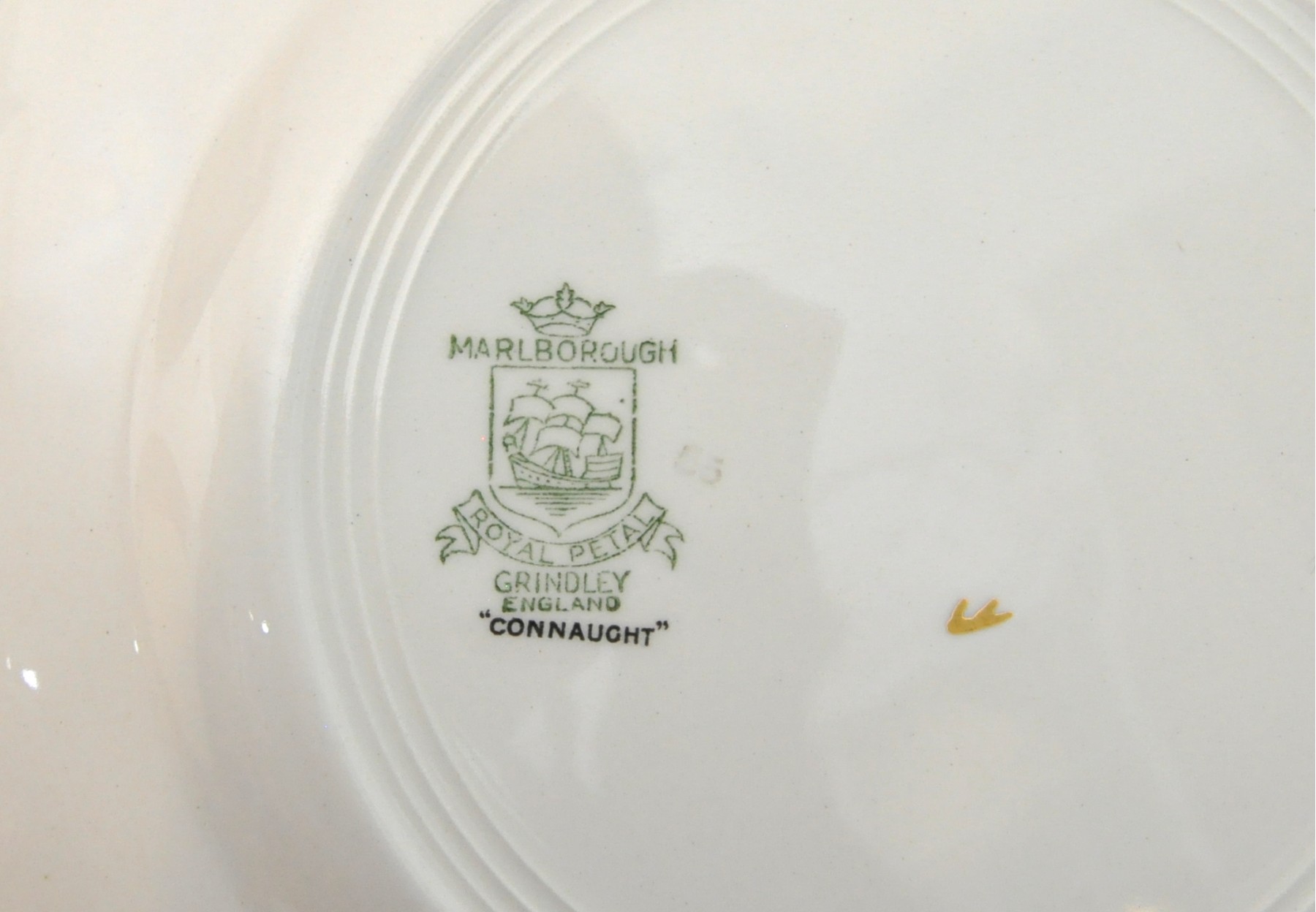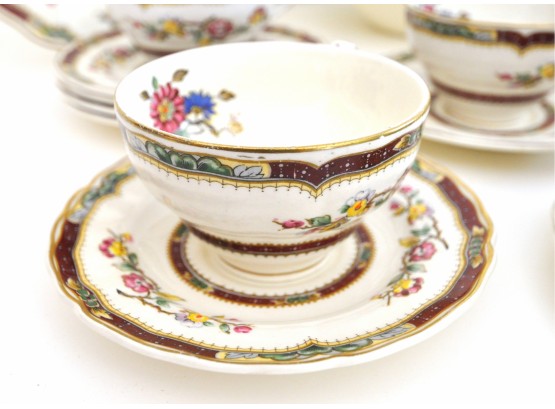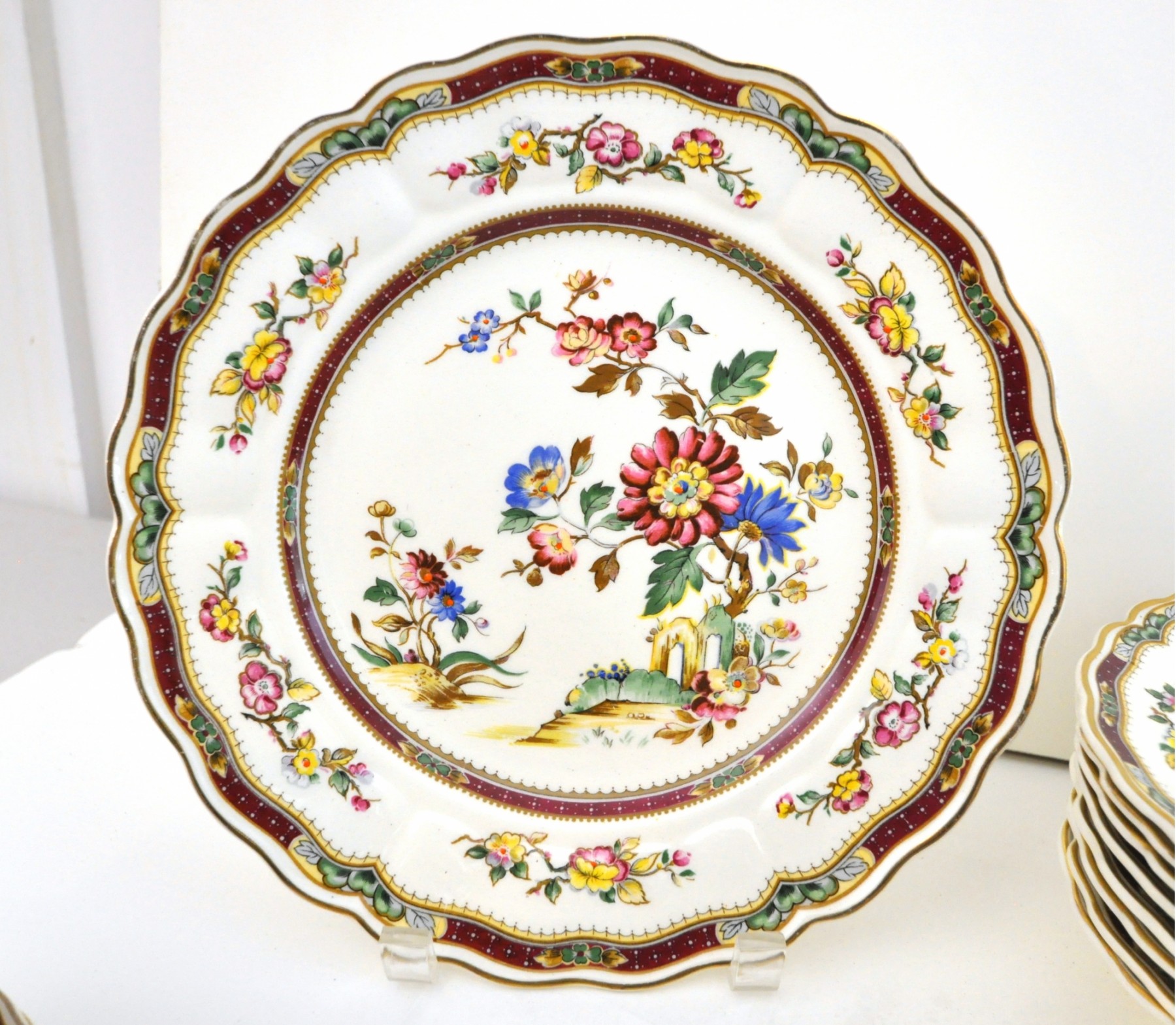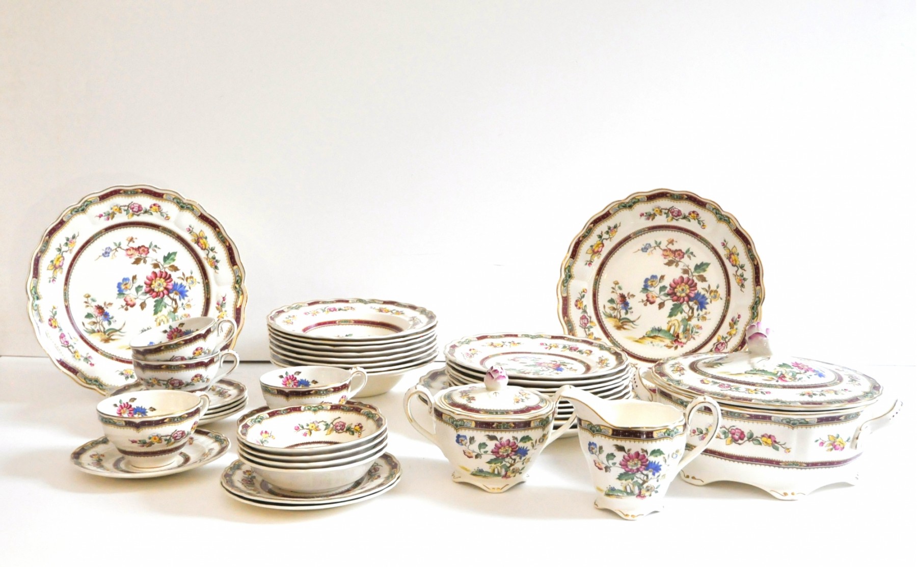 4- 10" dinner plates, 8 - 8" plates, 2 - 6" plates, 6 - saucers, 4 teacups, sugar and creamer, covered serving bowl, 8 - 8" soup bowls, 4 - 5" bowls