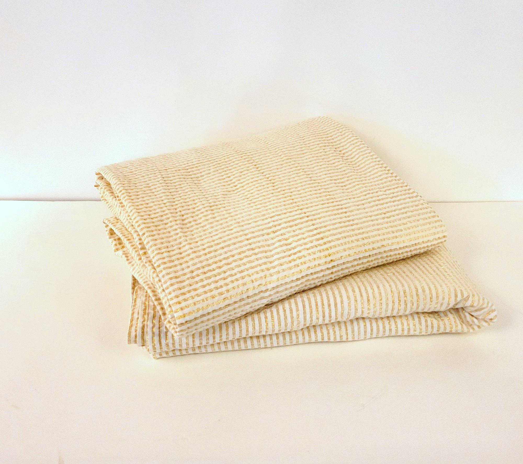 Two 56" x 84" tablecloths. 80% cotton/20% Lurex. Washed but unused.
