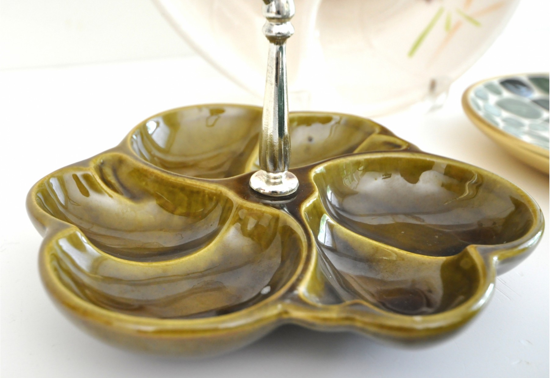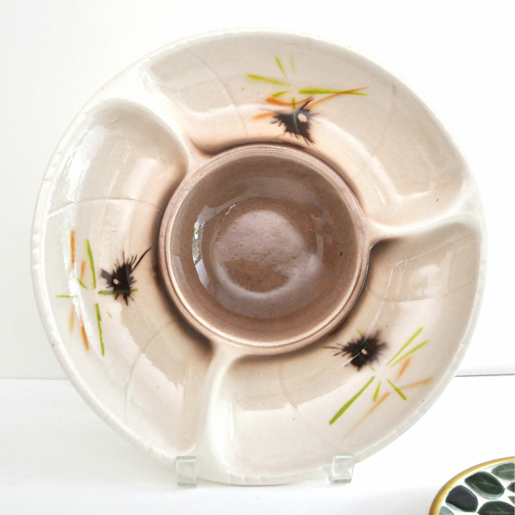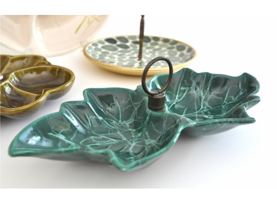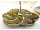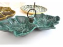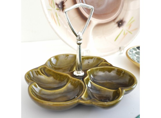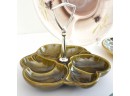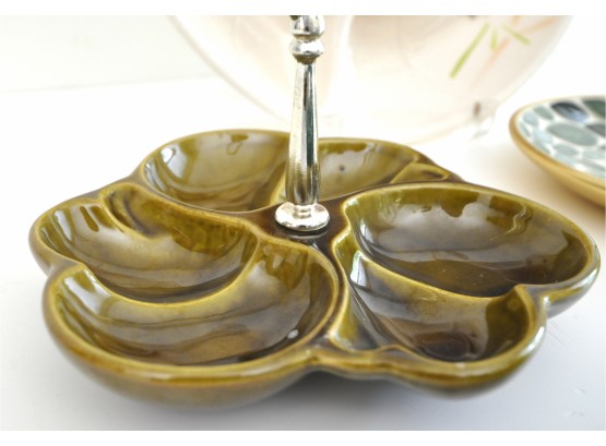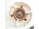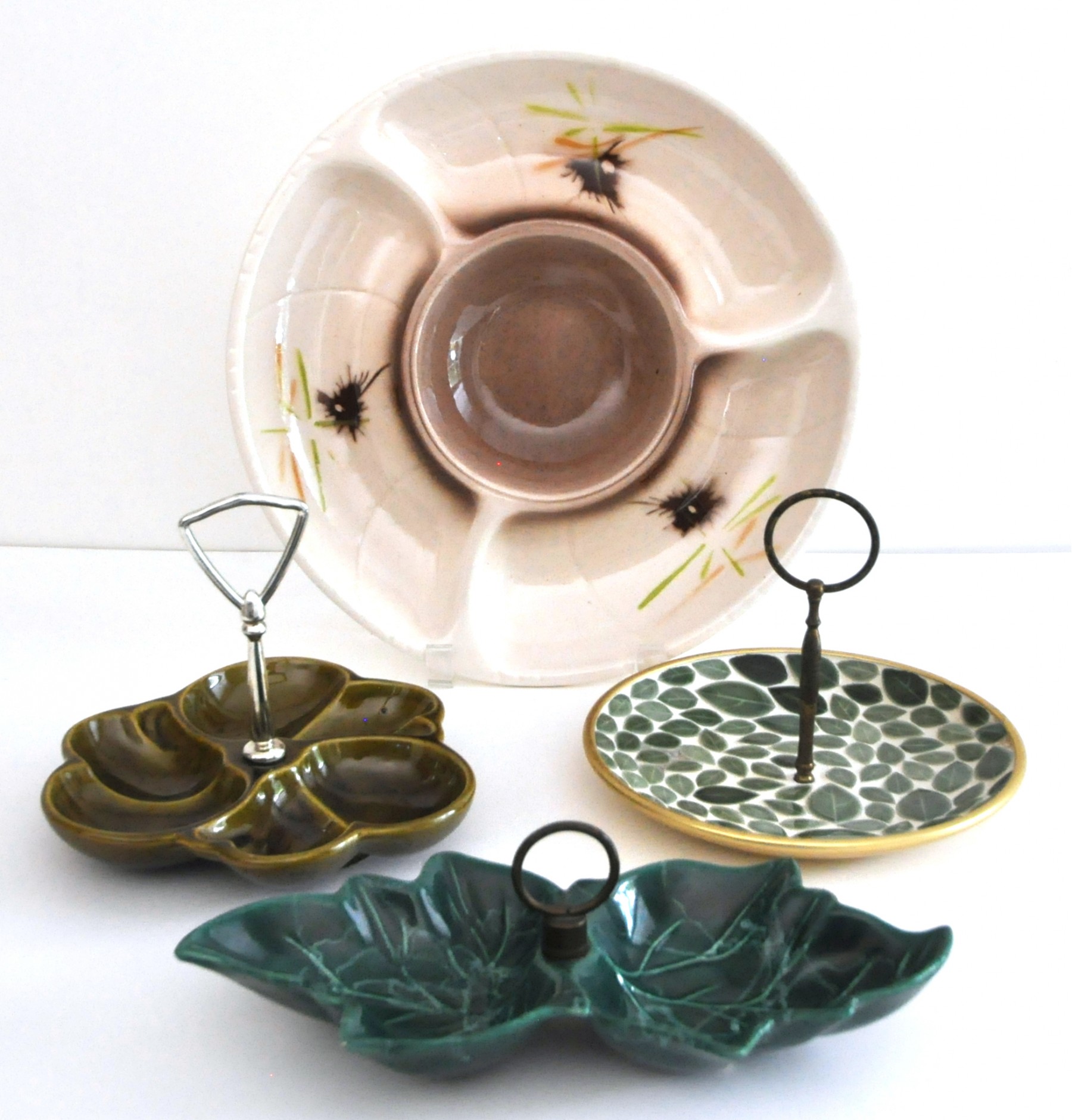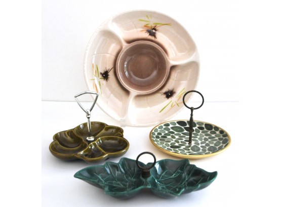 A 12" diameter chip and dip marked Lane and Co, California and three handled tid-bit trays.
