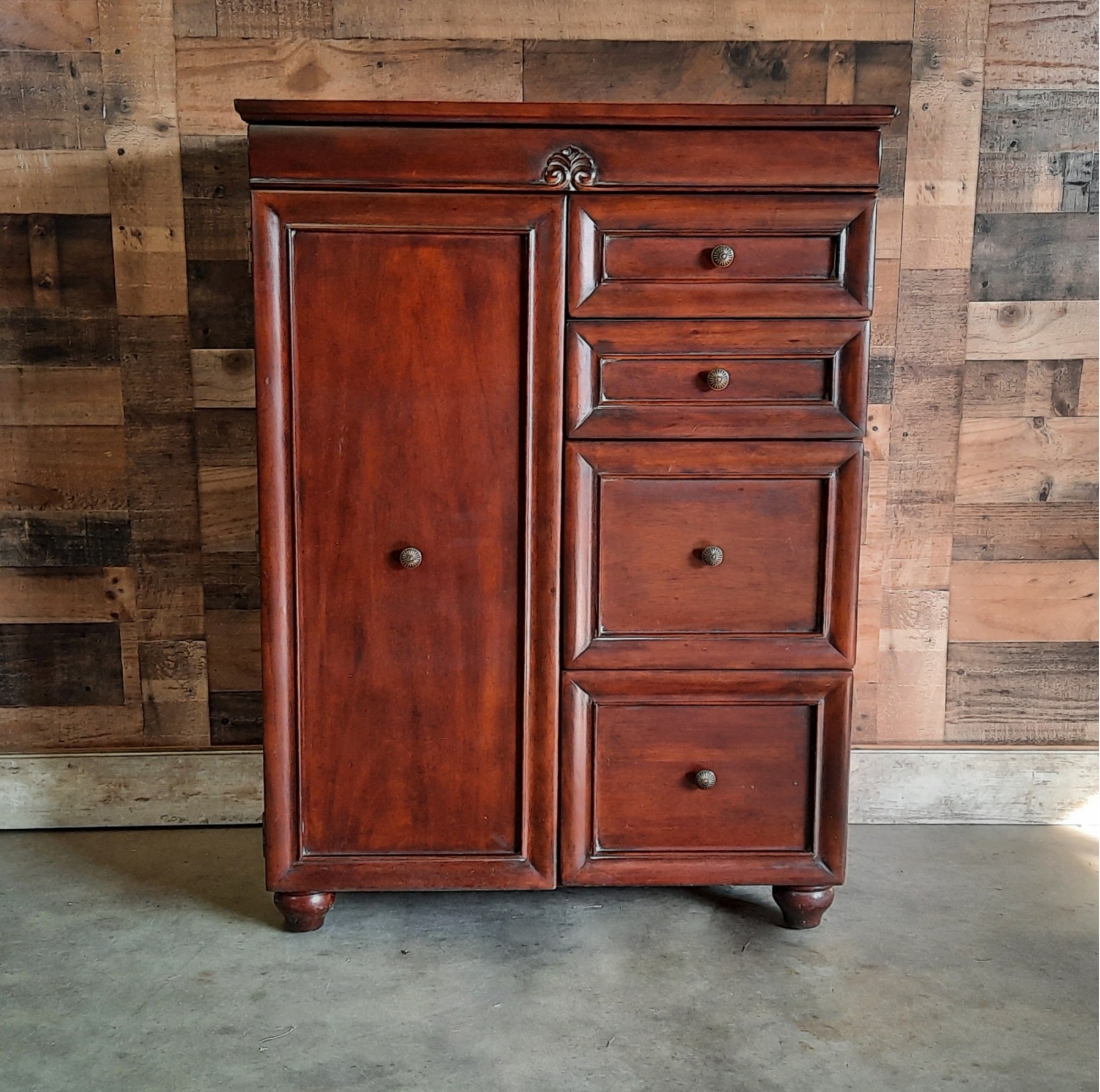 Three shelves behind the door, two file drawers, two storage drawers. There is some wear and tear to the finish. Please see photos.