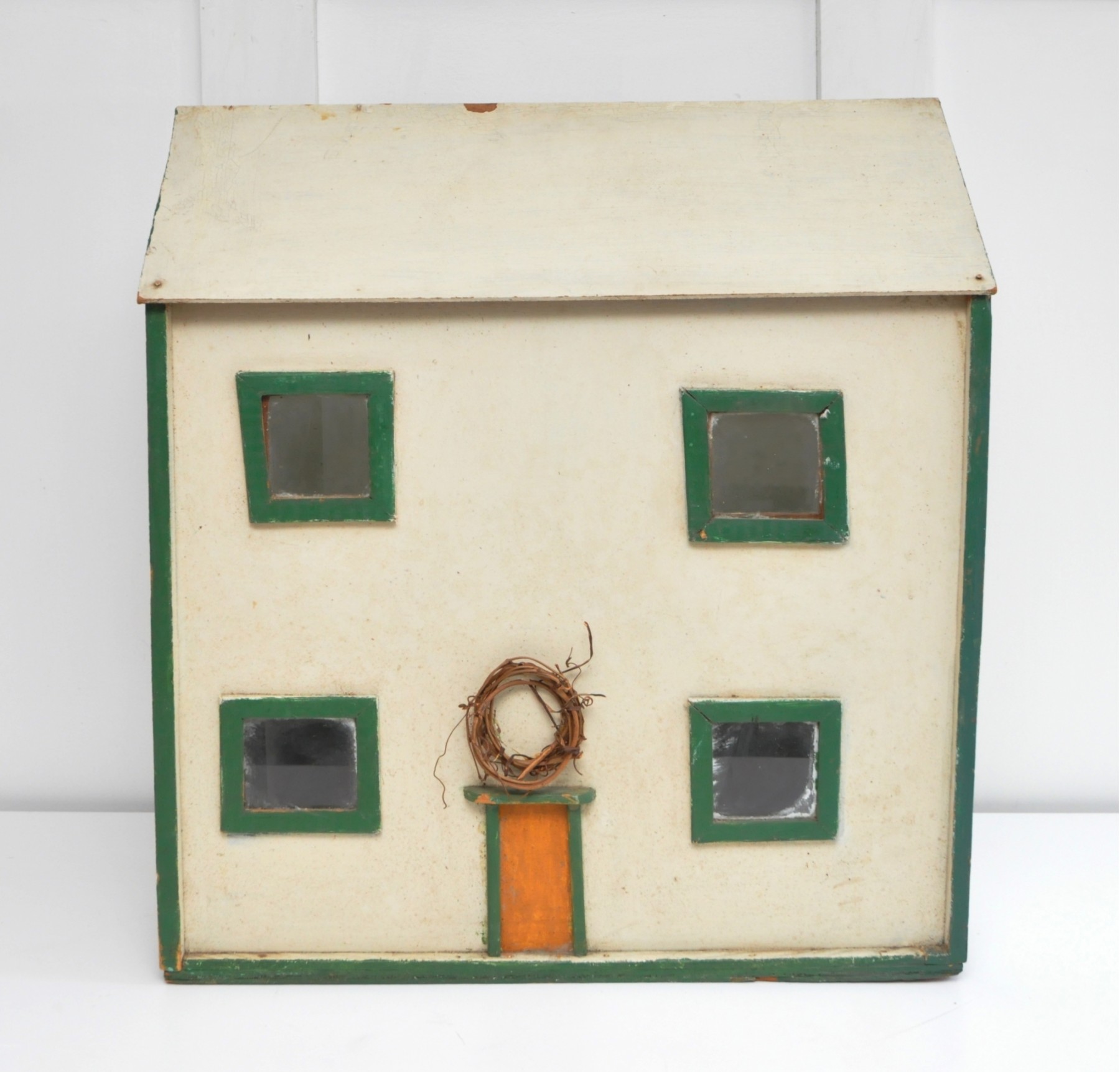 A very rustic, primitive style, handmade wood doll house.