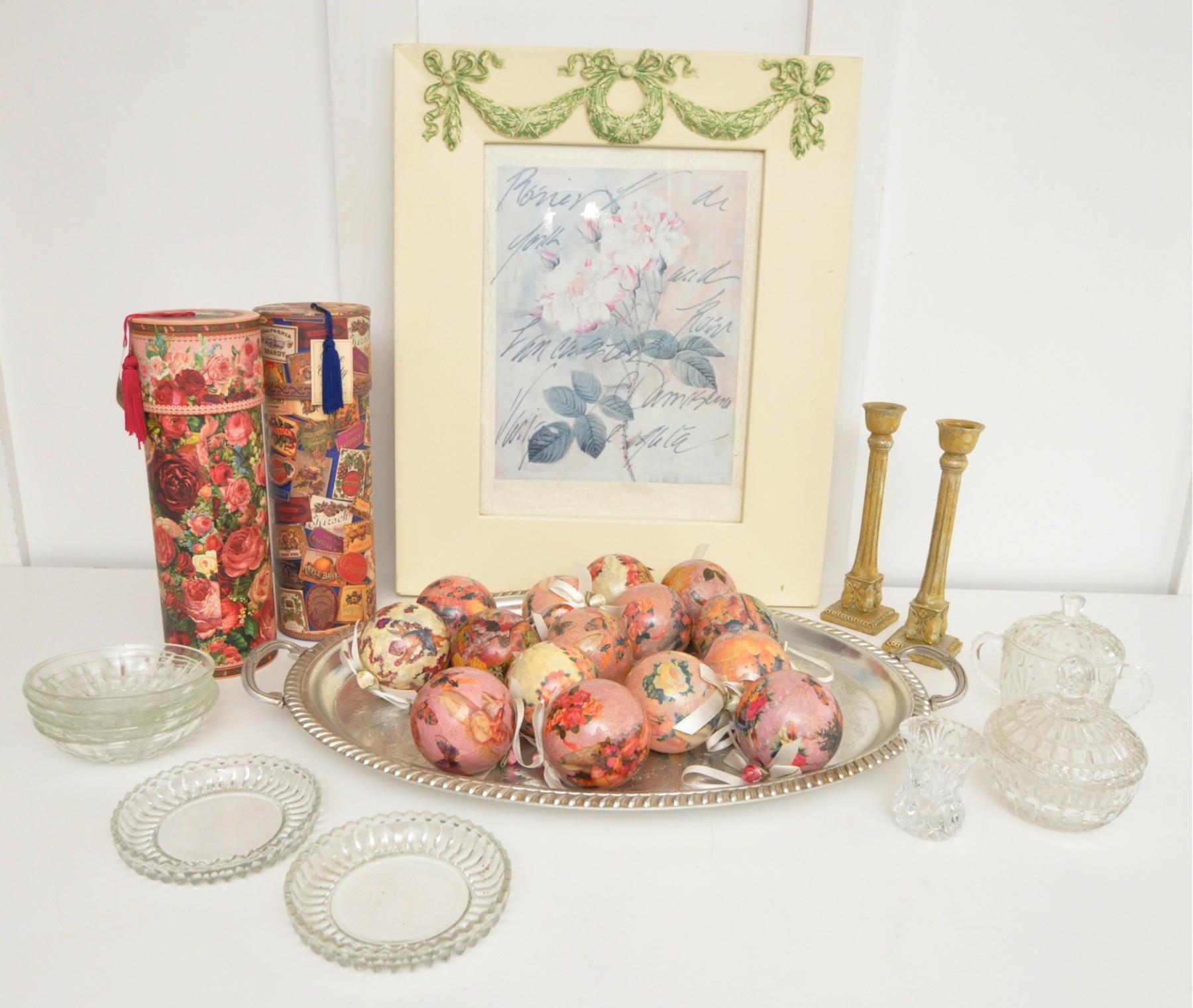 Large metal tray, floral ornaments, glass dishes, candleholders, wine bottle gift boxes and more.