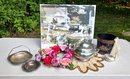 Silver plate, silver tone metal, silk flowers and more.