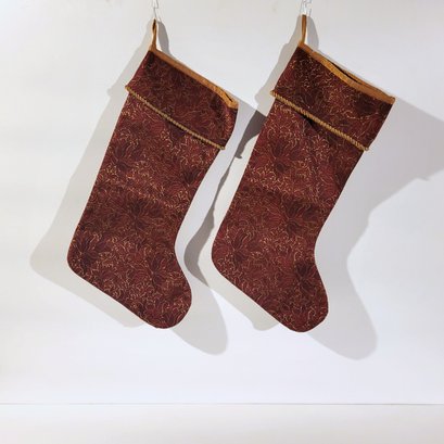 Two traditional style cranberry and gold Christmas stockings. They measure 18" long. Very good condition.