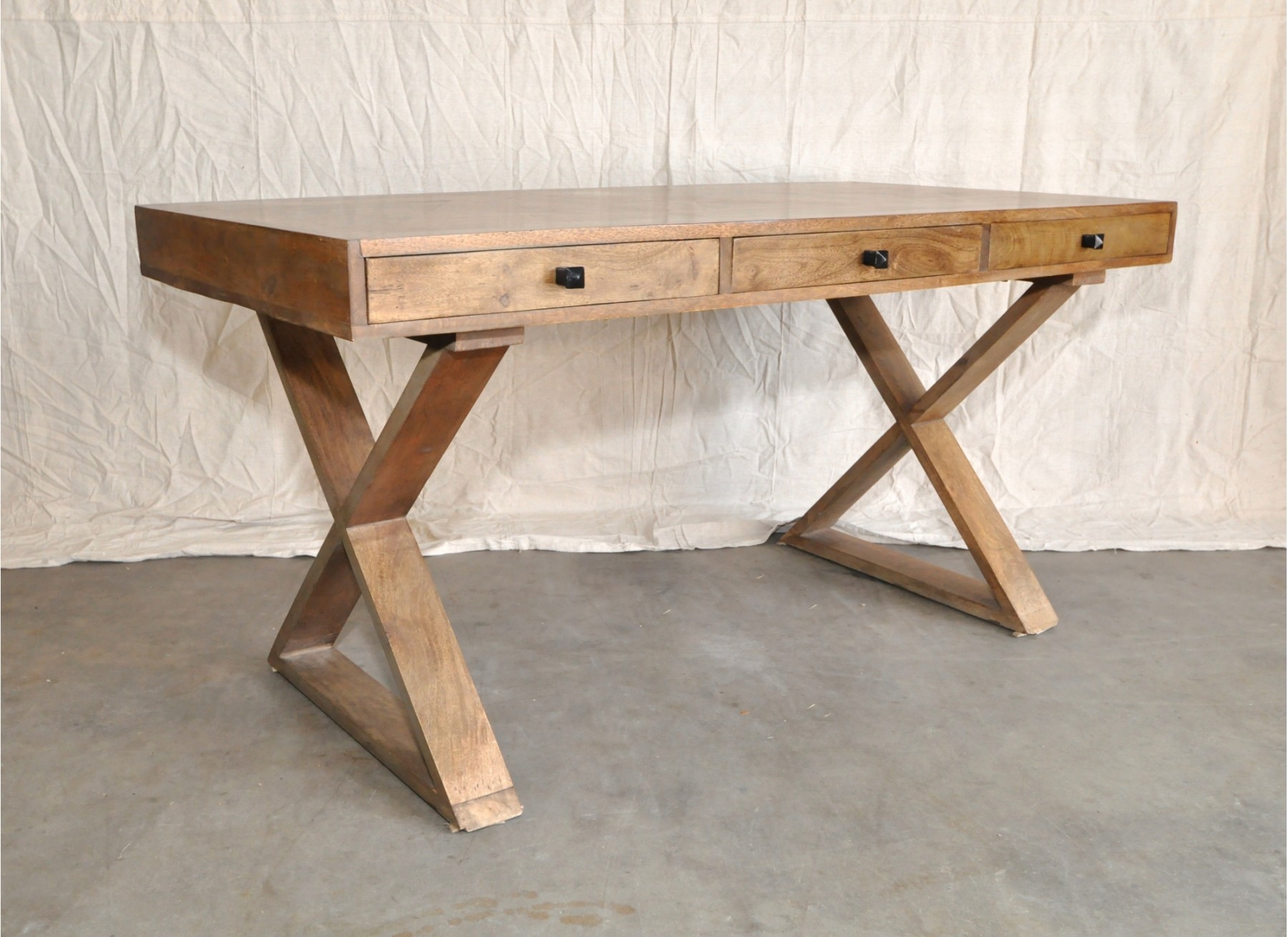 Three drawers, light wood. There is some surface wear to the finish and a few small chips to the feet.